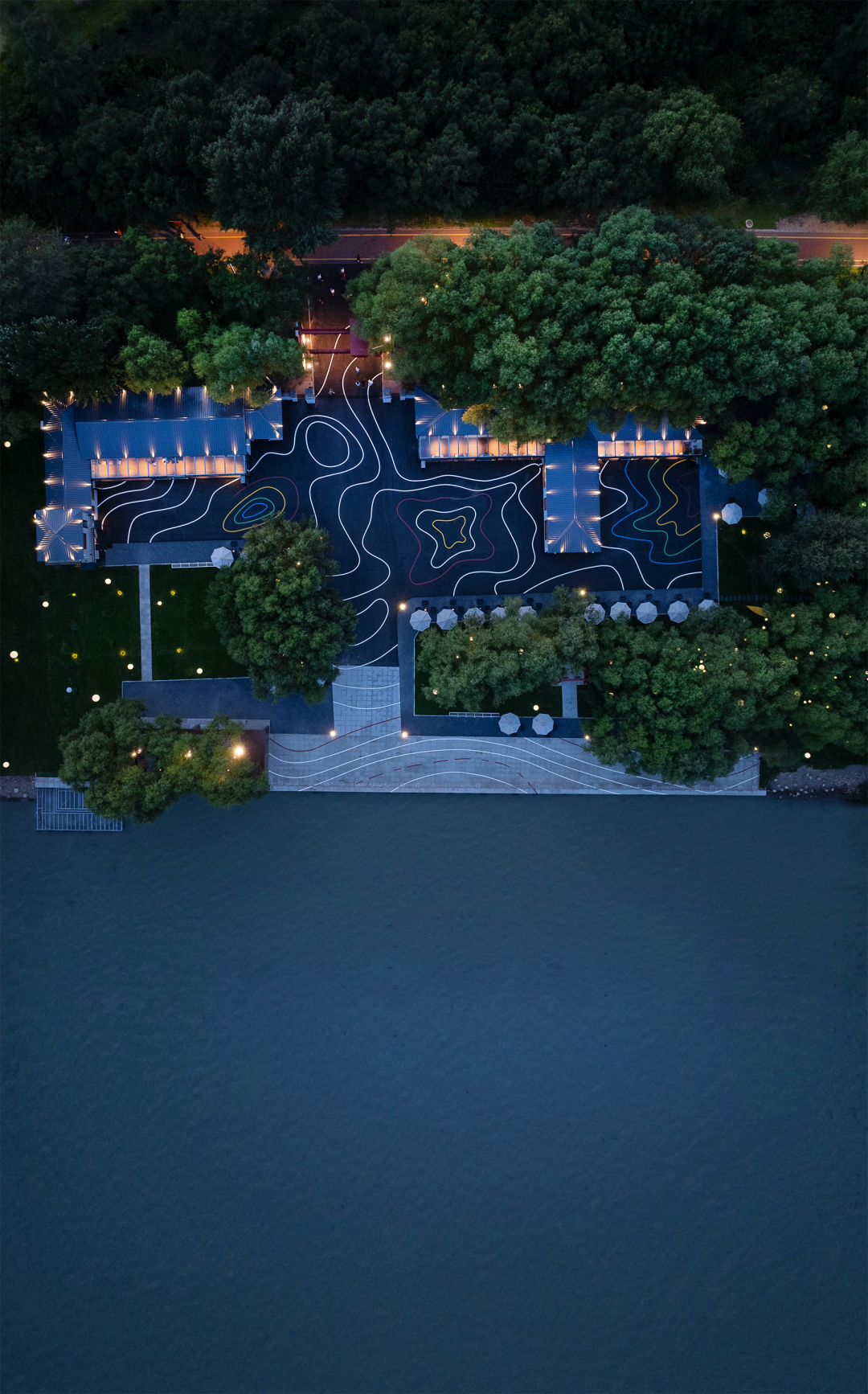 外围原本杂乱的植被经梳理与重塑,保留了部分具有阵列感与良好形态的植株,其余则修整为开阔的草坪。由此,建立起场地与湖面之间的视觉通廊。林间设置了独立片区的灯光变幻,在保持自然基调的同时,增强夜间互动体验。草坪作为留白区域,具备高度的功能适应性,既与湖景形成连贯对话,也具备持续运营和艺术更新的可能性。