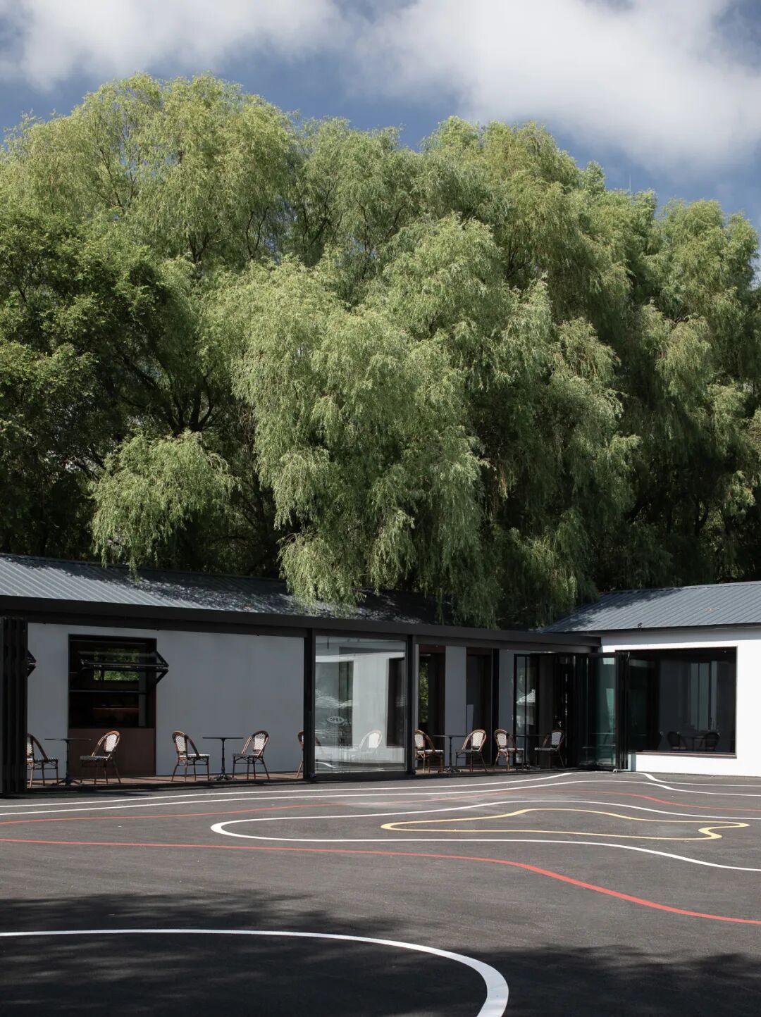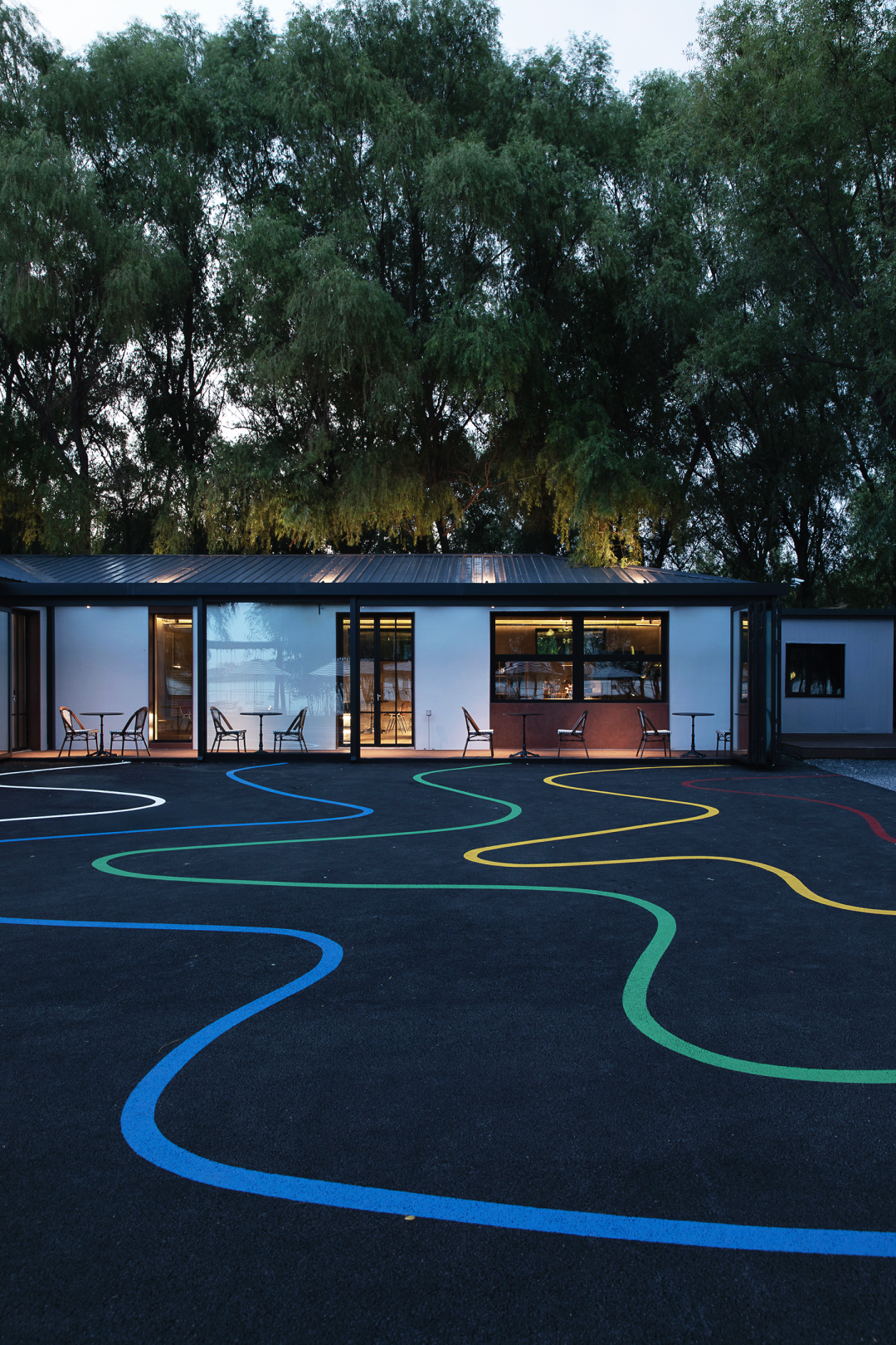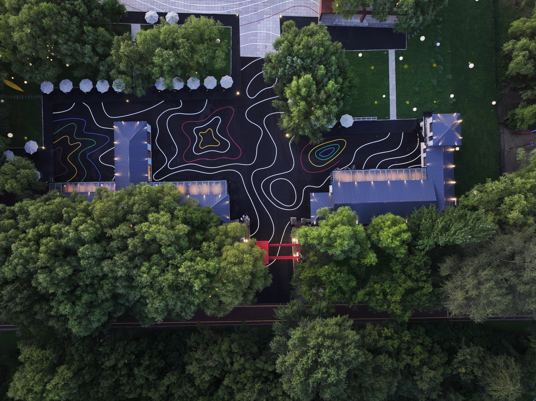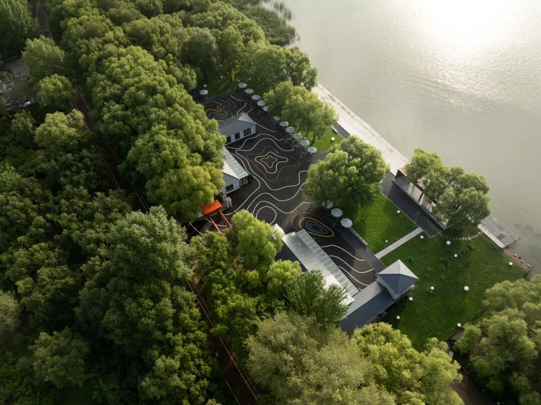 改造过程中,通过“轻介入”的策略,设计尽可能保留建筑原有的低矮形态,使其与湖岸的尺度和氛围保持共生。地面引入彩色涂鸦,以平面介入的方式增强场地的艺术属性和视觉层次。整体以水泥灰为基调,让建筑在环境中退让,由绿意自然地包裹,并向湖水方向延伸,形成环境与建筑之间的柔和过渡。
