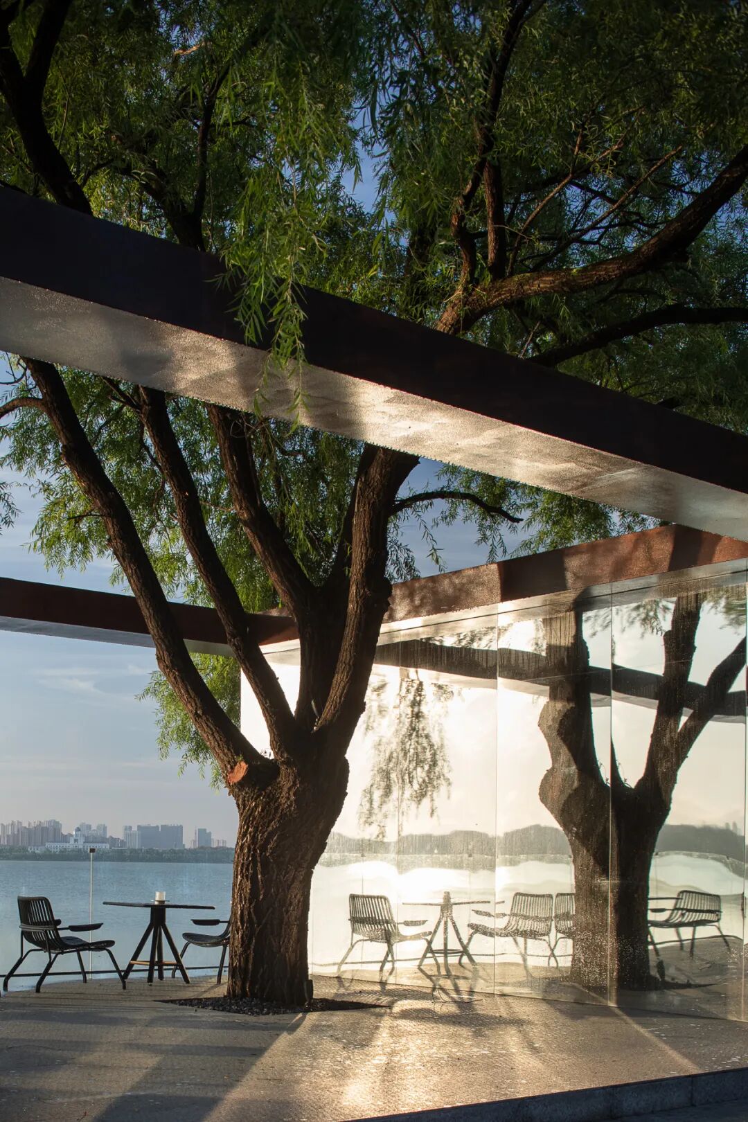 在湖边,我们设置了一处与保留下来的树木形成咬合关系的景观构筑物,内墙面覆以镜面,将湖面、树影与流动的天光反射于表面,形成持续变化的虚实视觉交互。它既界定出不同的社交场景,又保持了场地整体的开放性与流动性。