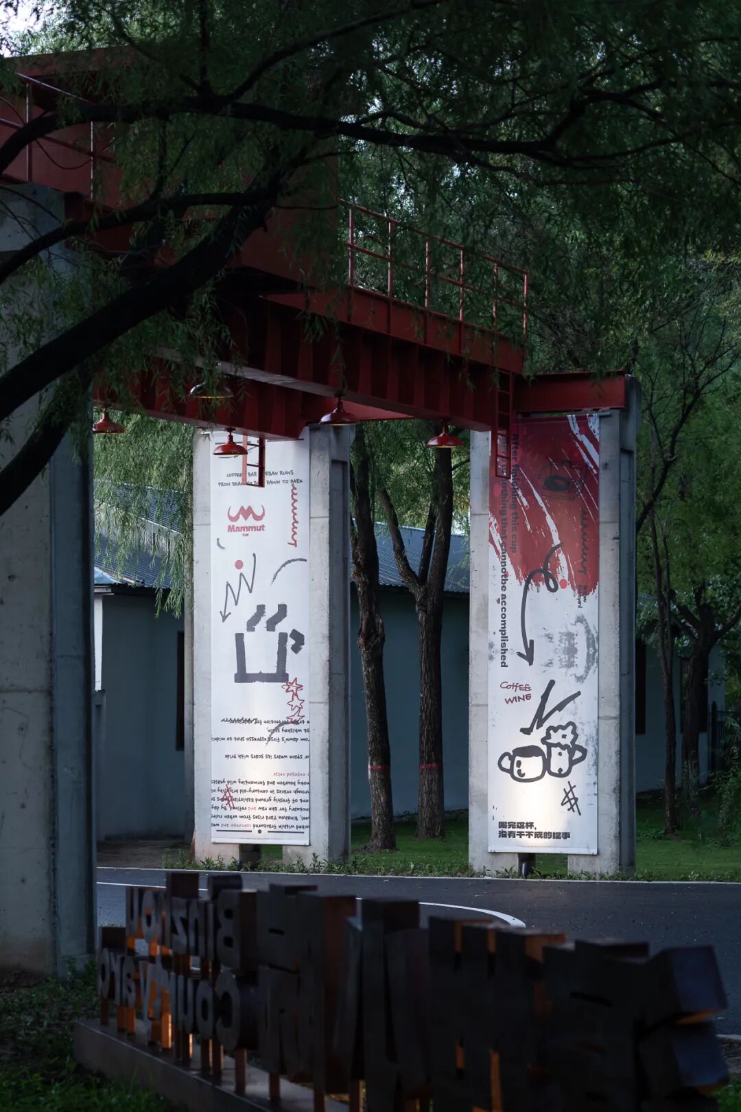 入口设计以一座龙门吊作为场地的核心标识,其灵感源于场地原有的码头工业记忆。这一结构不仅是对场所历史的当代回应,更以强烈的视觉形式成为城市更新的鲜明符号。通过海报强化视觉张力,不断吸引人群驻足互动,营造出兼具仪式感和剧场性的入场体验。