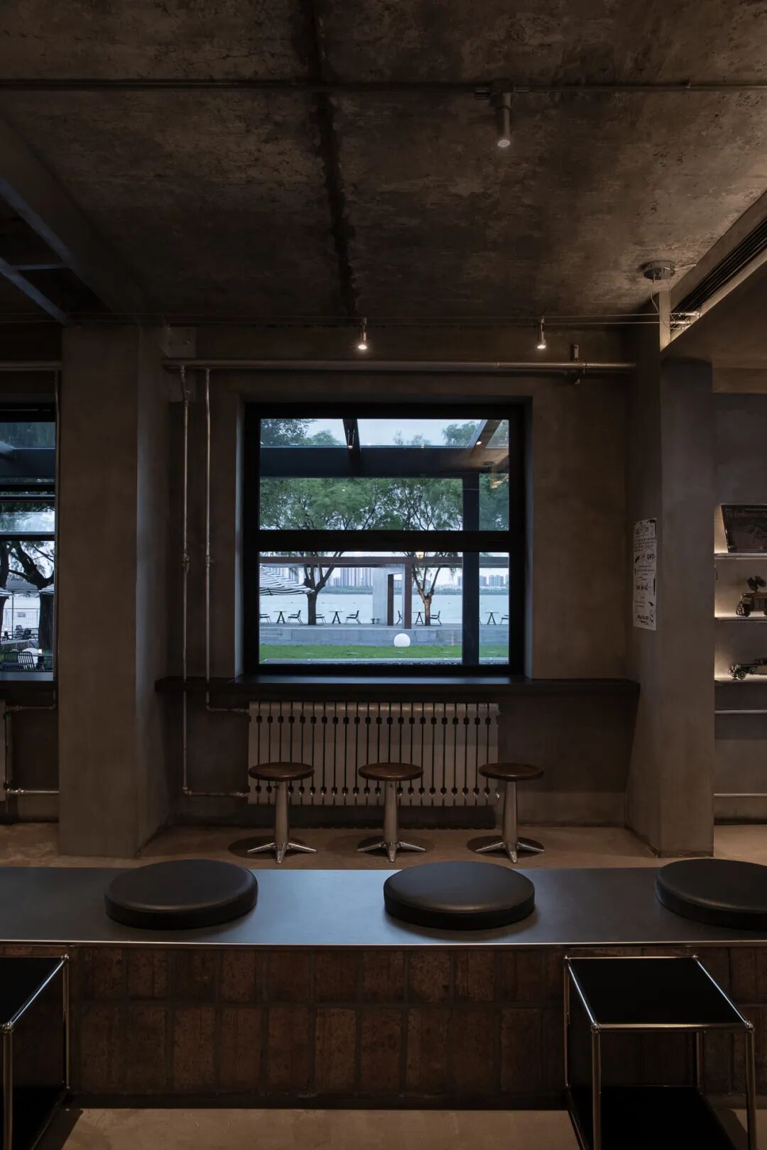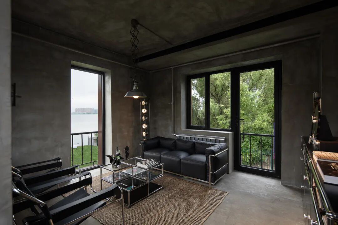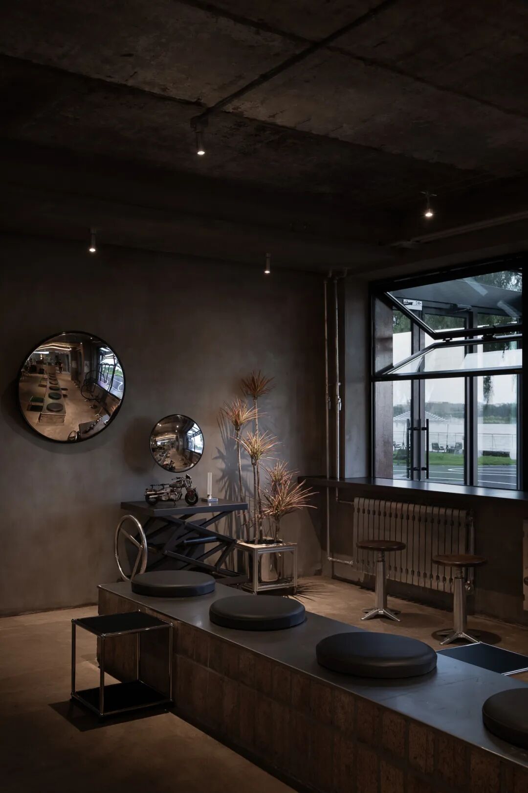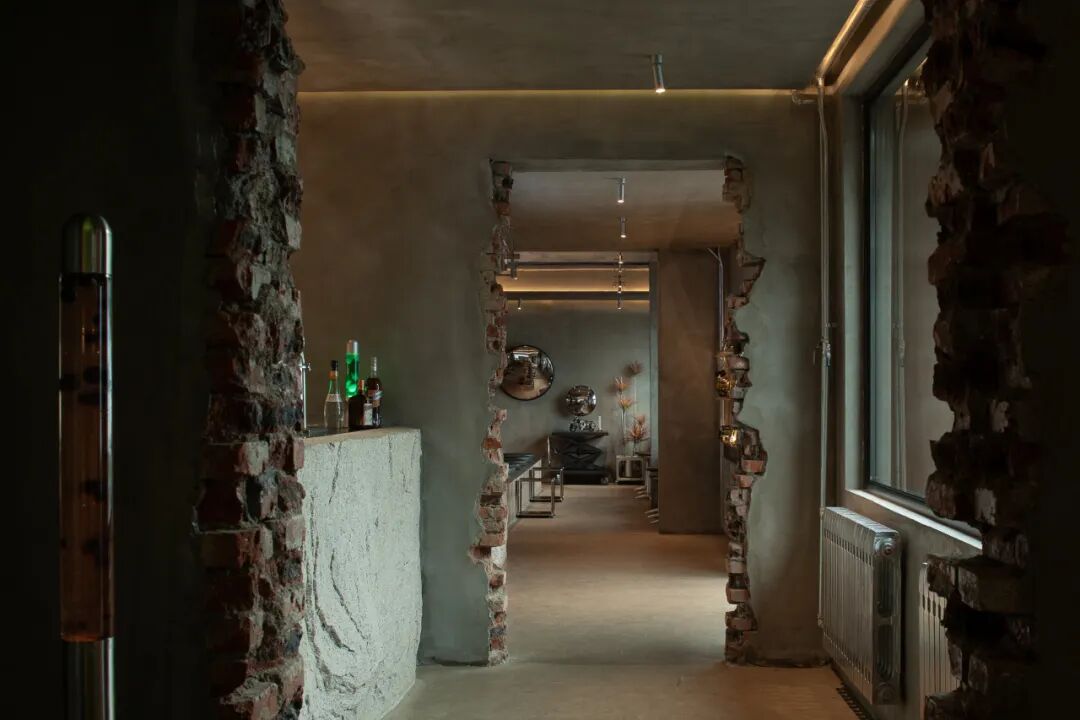 在设计过程中,原始工业结构得以充分保留并转化为场景叙事的核心元素。裸露的内部结构,水泥质感墙面以及原有暖气片与管道经银色喷漆处理,软装选择在延续粗犷工业基调的同时,赋予其统一的当代视觉语言。