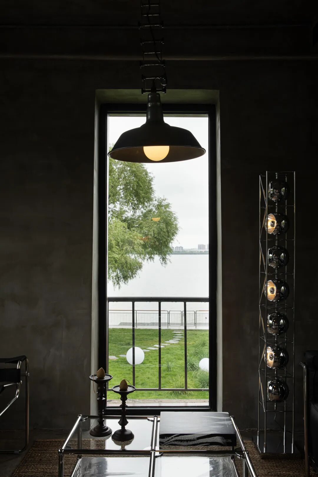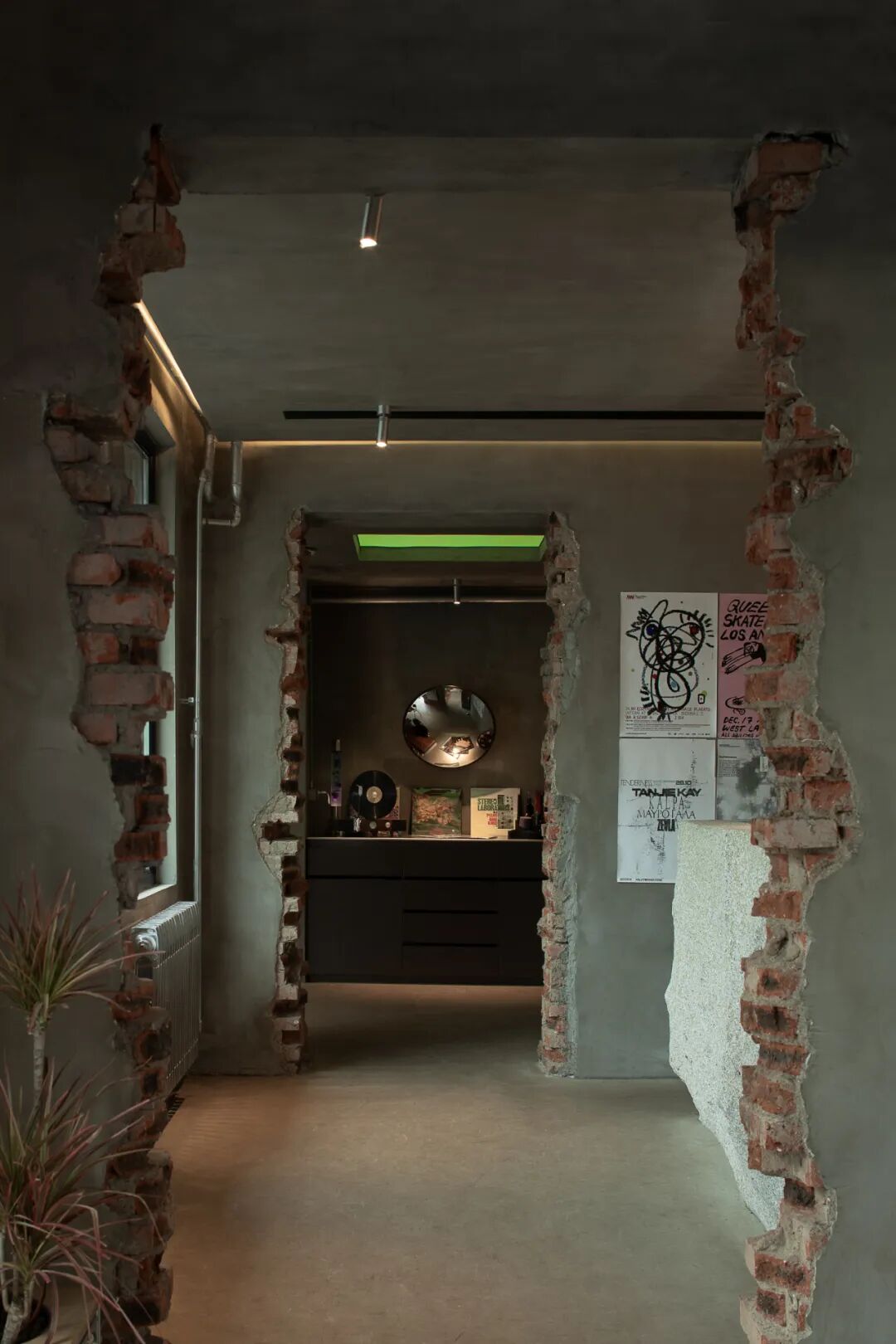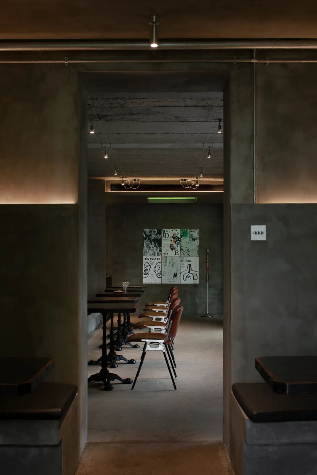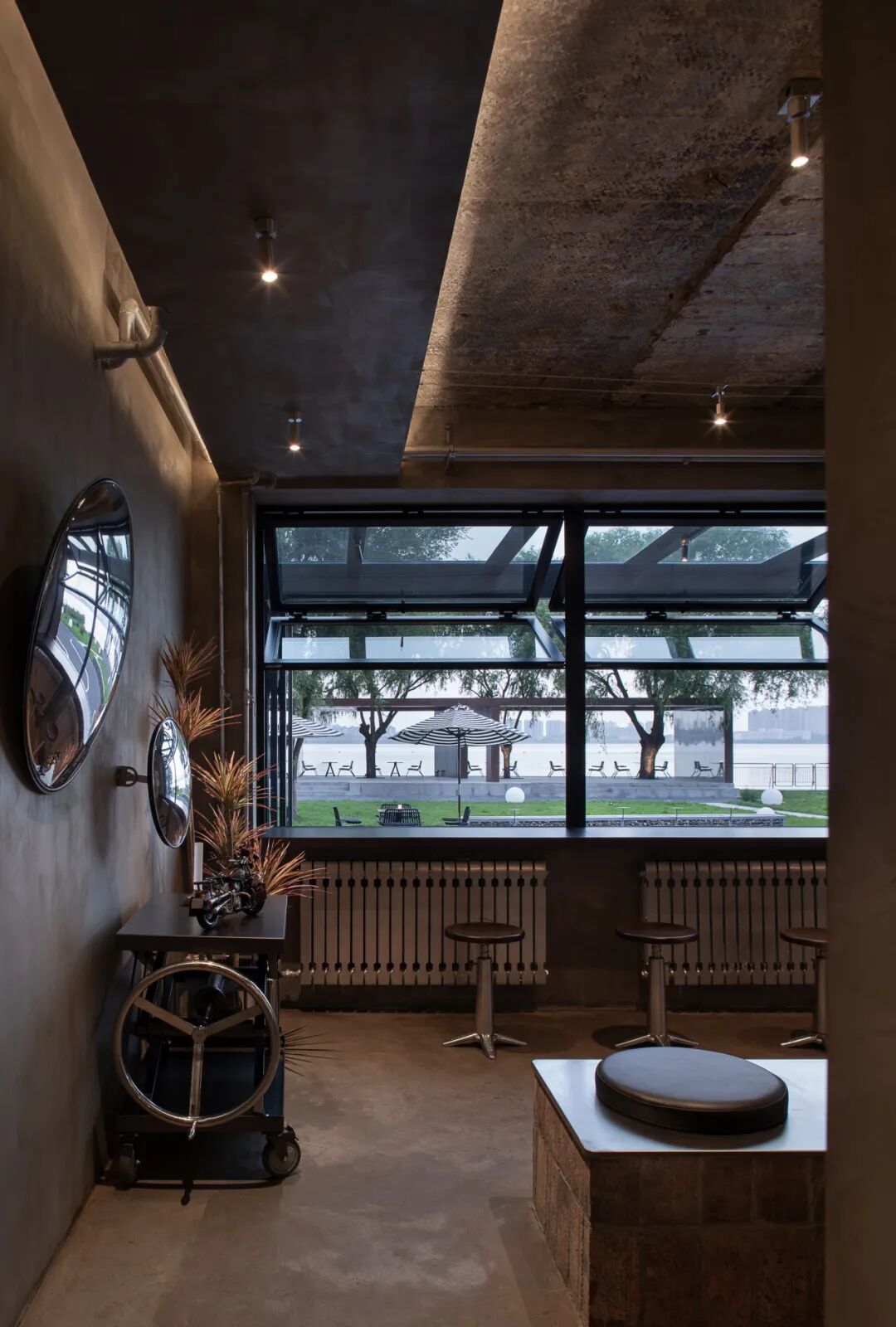 在设计过程中,原始工业结构得以充分保留并转化为场景叙事的核心元素。裸露的内部结构,水泥质感墙面以及原有暖气片与管道经银色喷漆处理,软装选择在延续粗犷工业基调的同时,赋予其统一的当代视觉语言。