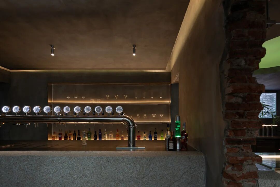精酿区域的吧台犹如机械装置,在水泥肌理背景下更显力量感。夜幕降临时,灯光从背后的酒架与玻璃杯间洒落,折射出层层光影,为空间增添了富有氛围感的气息。场域的变化与多元消费场景紧密结合延长了客人在夜间的停留时间,为场地的运营活力带来可持续价值。