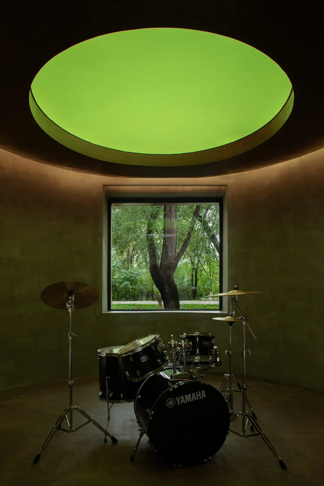在另一栋建筑里,设计延续了充满未来感的可变色光影,增强空间的戏剧性。灯光下放置的架子鼓,不仅是一个功能乐器,更如同一处即兴舞台的象征,邀请人们在此释放创造力与情绪,仿佛随时可开启一场不受拘束的表演。这不仅满足了年轻人对互动和新鲜感的需求,也为场域带来持续的话题性。