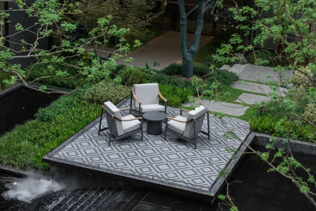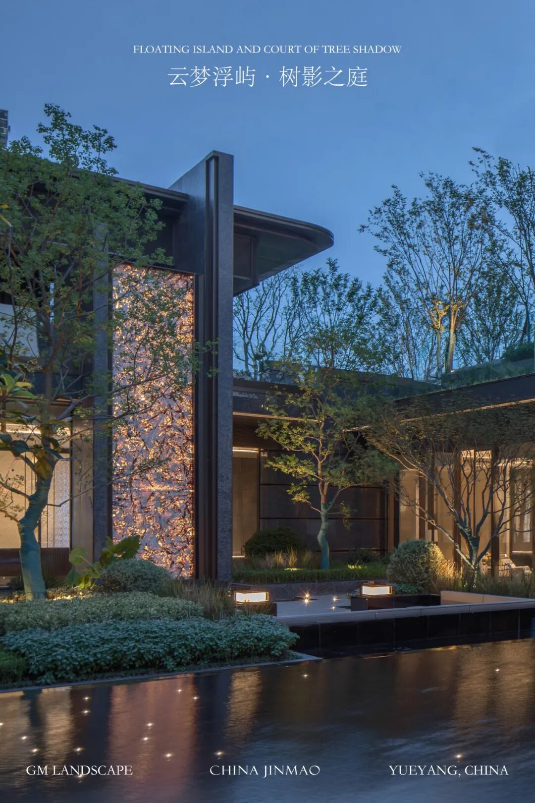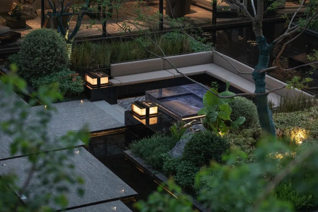 庭院之中,亲水平台、绿岛组团与浮岛客厅相互映衬,勾勒出丰富而灵动的空间层次。轻盈的汀步漂浮于水面之上,引导居者漫步其间,或坐于水畔会客闲聊、品一杯咖啡、静读一册好书,耳畔是潺潺水声,眼前是绿意环绕,不知不觉间,人便已成为这幅“动态山水画”中的一部分。