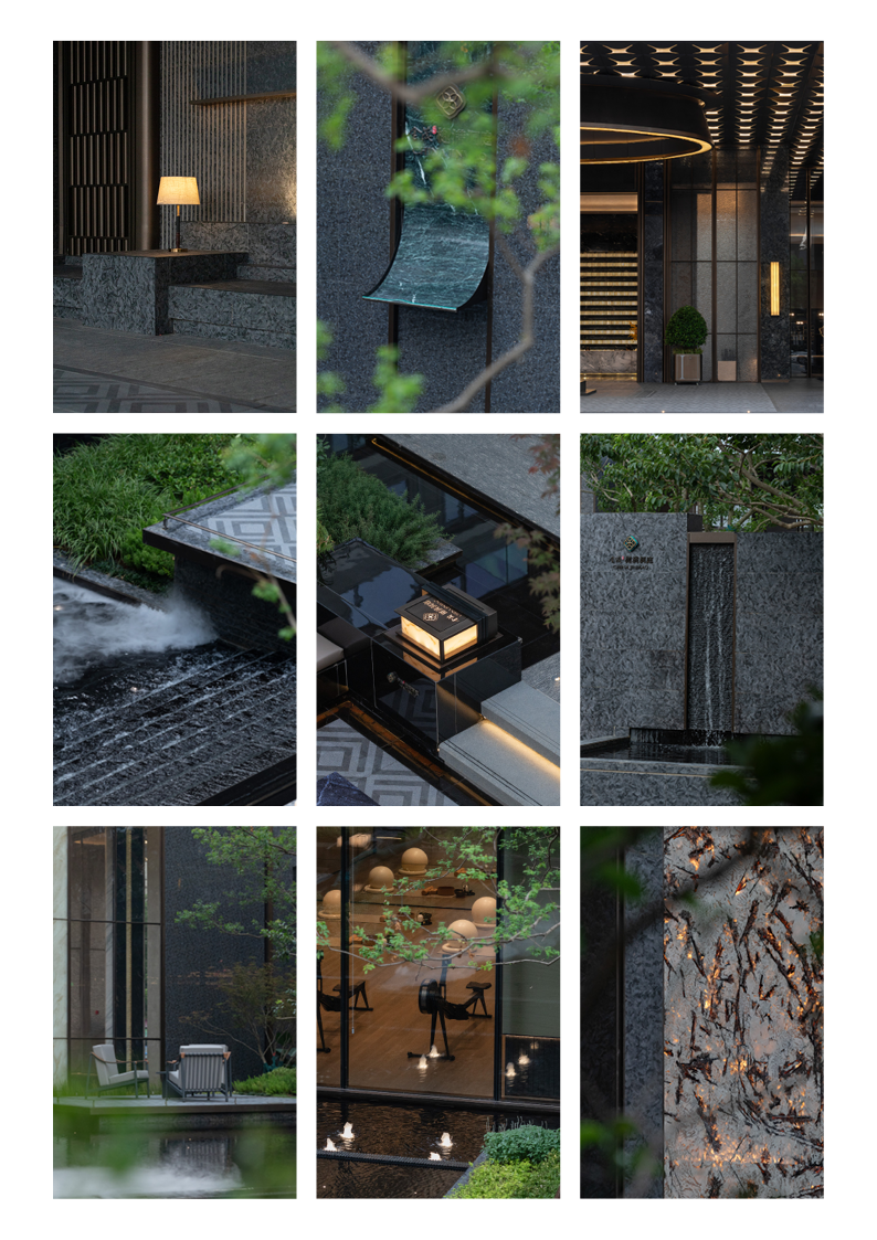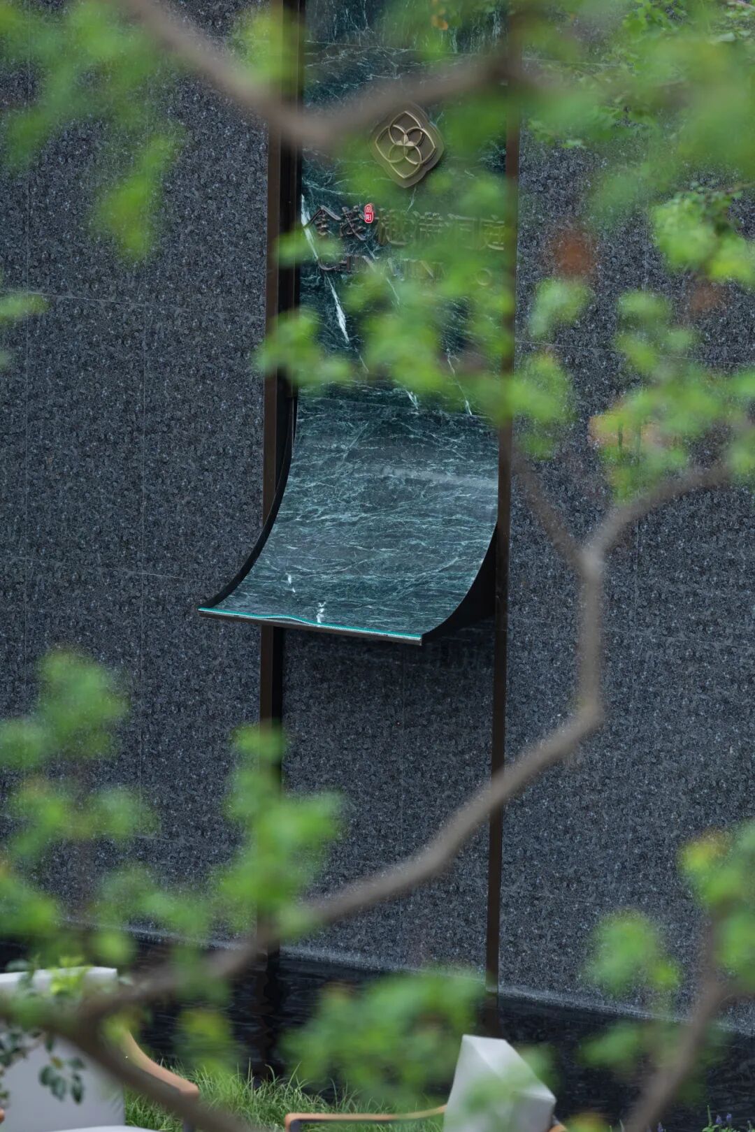 对景景墙以简洁的线条与细腻的肌理,构成空间沉稳的背景与视觉焦点。水景于此化为灵动之笔,清冽的跌水层层而下,水声潺潺,打破静谧却更显幽深。绿植柔化了建筑的棱角,在水光倒影间摇曳生姿,营造出一处令人心境沉淀、充满礼序的仪式空间。