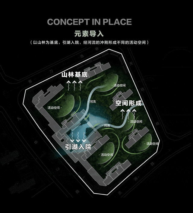 概念萃取“云梦自然”中的平原、山陵、湖泊、树影与岛屿元素,借“浮屿绿洲”之形,构创起伏有致、层次丰富的空间格局。引湖入院,模拟自然河流冲刷形态,形成多元活动场所,实现功能与艺术的交融。同时,融入“山林静思”的人文哲思,于喧嚣都市中辟出一处可驻足、可冥想的精神栖所。