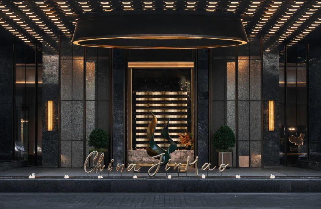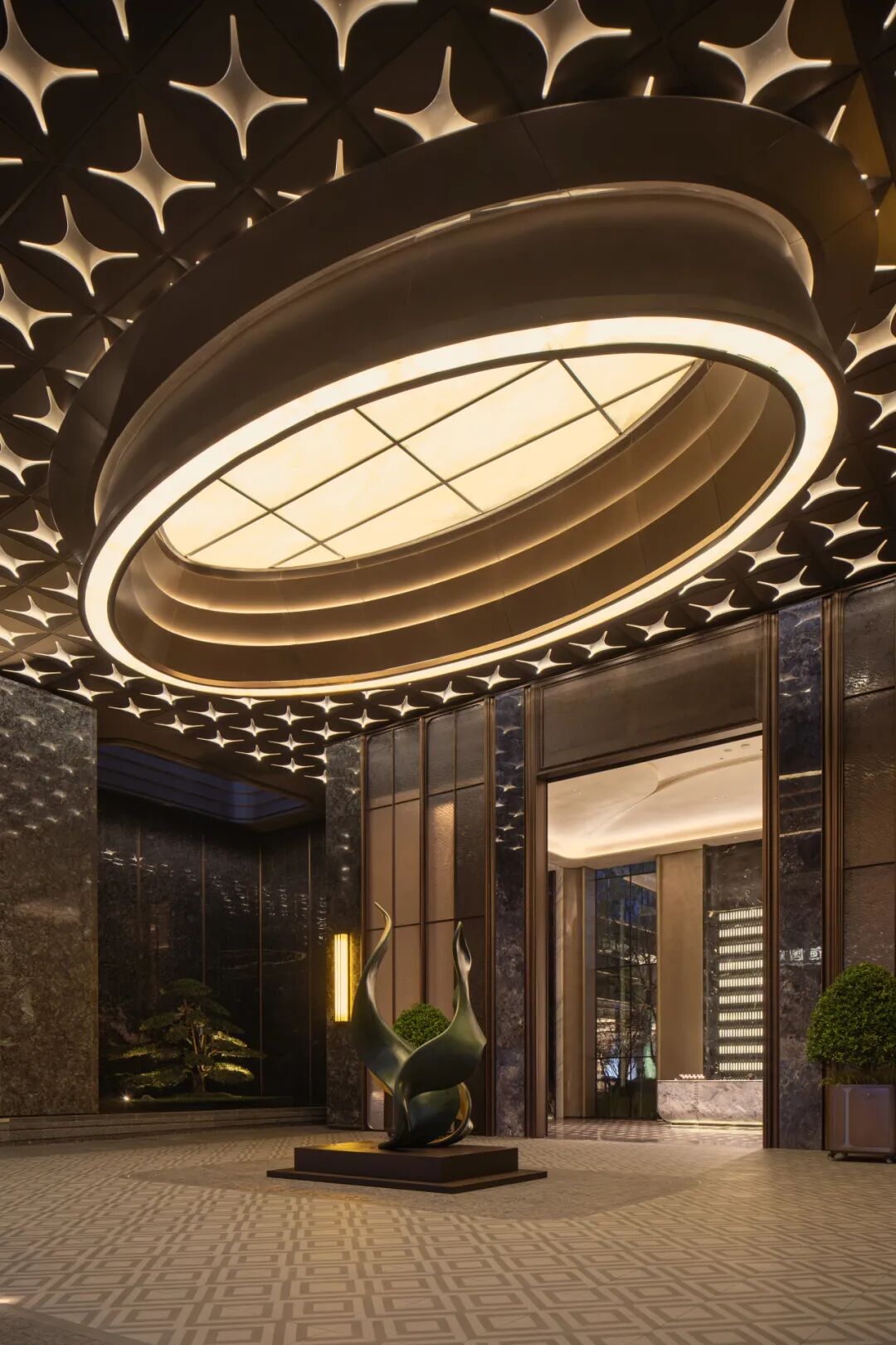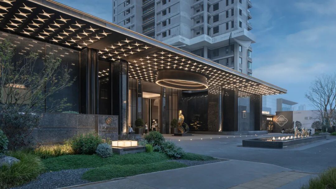 以五星级酒店前场为范本,规制约55米超宽尺度,于岳阳堪称罕见。设计取意古城经典礼序,以“门-廊-厅”三进制格局层层递进,营造富有仪式感的归家动线,于宏大间尽显门第气度与当代审美。