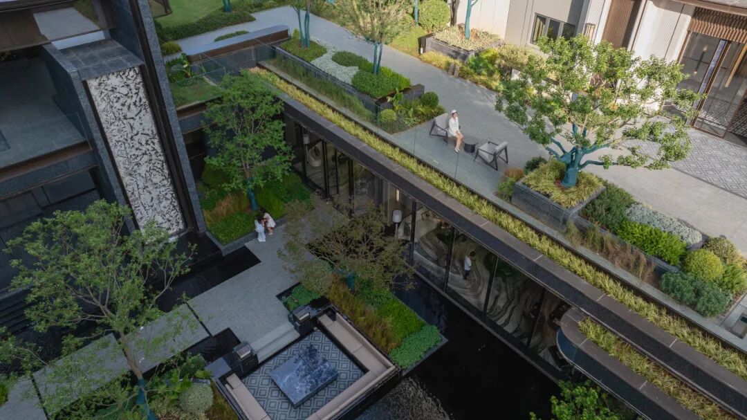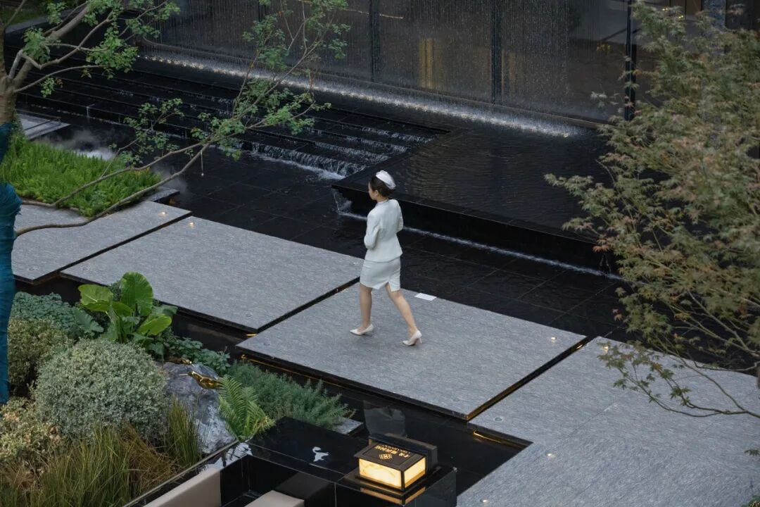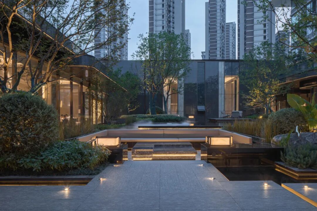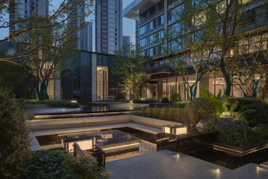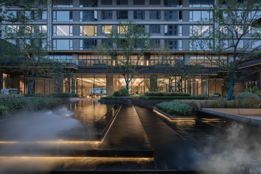 下沉式庭院会所堪称整个社区的“点睛之笔”,巧妙利用场地高差,塑造出一处约5米落差的“山涧飞瀑”,水流跌宕,声如鸣佩,成为视觉与听觉的双重焦点。在造园意境上,借鉴中国传统山水画与古典园林步移景异、小中见大的造园精髓。