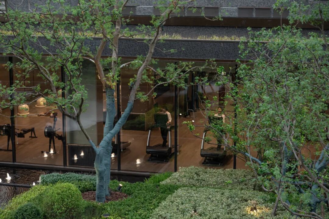 景观会客厅是休憩与社交的静谧所在,厅内两侧分别点缀着温馨的氛围小灯与灵动的小猫雕塑,于细节处平添趣味与暖意。空间最大的魅力在于其视野,通透的界面俯瞰整个下沉庭院,将瀑布、绿岛与水景尽收眼底,如同一幅动态的立体画作。