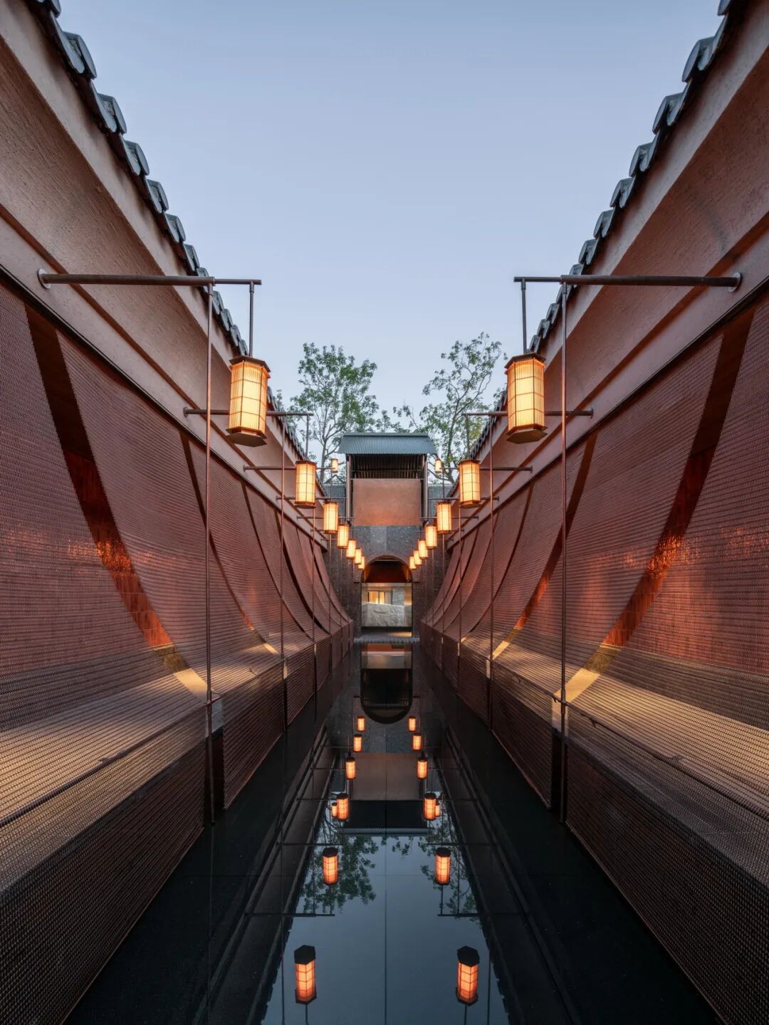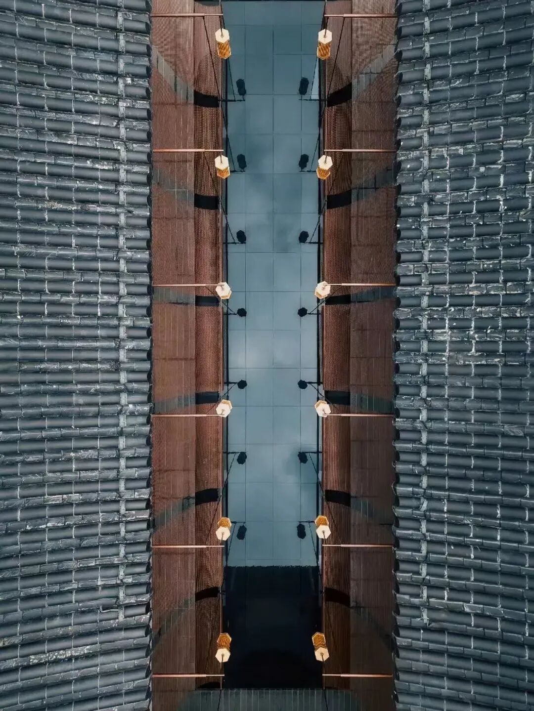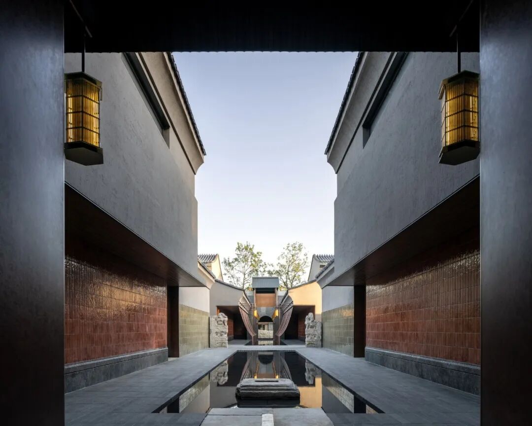 抵达客房的体验被精心设定为层层递进的时空戏剧:大堂庭院以现代几何语言融合大同石窟地景,给人以对望北魏平城历史与丝绸之路的文化冲击;信步向前,铜门打开,幽深的院落水面如镜、帘幕漫卷,将情绪带入山西民居的想象;登高瞭望,城墙与城门依稀可见,古今对望。五进穿堂,流水回环,关于大同的印象一进一进打开。
