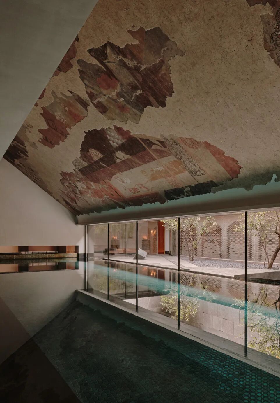 作为整座酒店体验的高光,地下泳池则如同从天然山体中凿刻出来。巨大的斜壁从地上一直延伸至地下,其上的壁画由云冈研究院主持壁画修复的艺术家高平传老师创作。当天窗光线投下,水光在斜壁上的壁画上跃动,留下天然洞窟般的质朴体验。