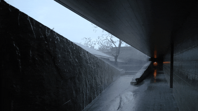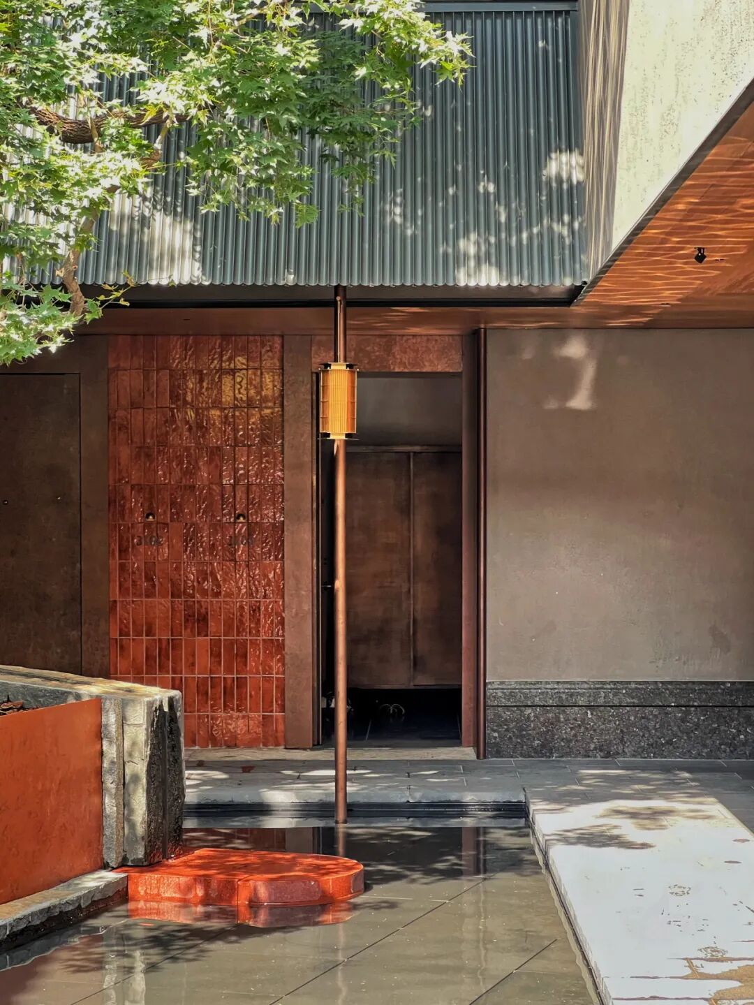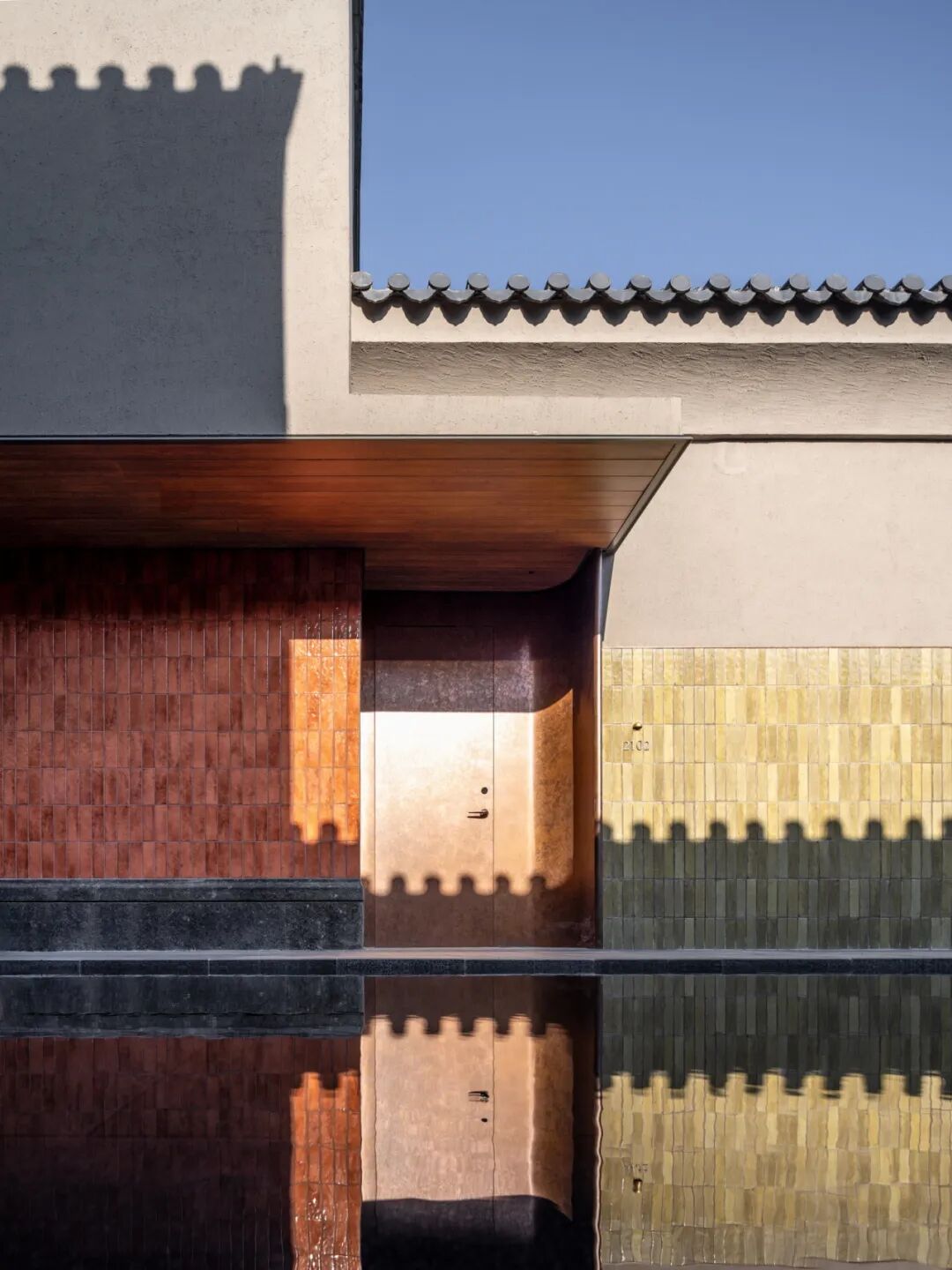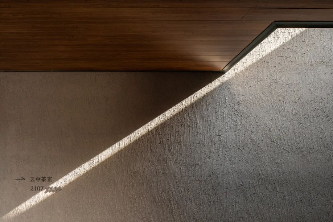 利用不同材料的着光性与色彩,为空间创造光的氛围:景墙的镂空格中藏有弧面实体,在日光之下有佛影幢幢之意味;弱反射性的瓷砖在晨光夕照之中,将色彩弥漫于廊道;木质吊顶成为水光潋滟的画布。