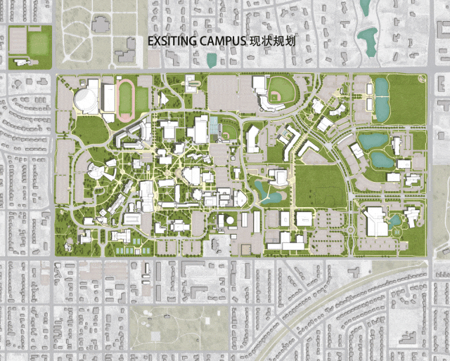 总体规划将伍尔西楼战略性地布局于威奇托州立大学历史主校区与创新校区的交汇点,成为物理与象征意义上的连接点。校园规划主轴与中庭有意重合,将大学的学术传统与前瞻性的商业与创新生态系统有机融合。