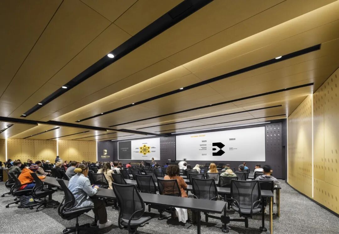 伍尔西楼的建筑语言展现了威奇托作为“航空之都”与“农业之乡”的双重身份。建筑以镀锌立面包裹,柔和的弧形外观优雅地致敬该地区深厚的航空传统;交错的木质饰板则唤起人们对麦田与该地区农业根源的联想。大面积的玻璃幕墙柔化了立面,并在夜间散发光芒,成为夜间学生和社区成员的温暖灯塔。这些元素共同塑造了巴顿商学院崭新而友好的形象,与校园环境及威奇托的产业特征高度契合。