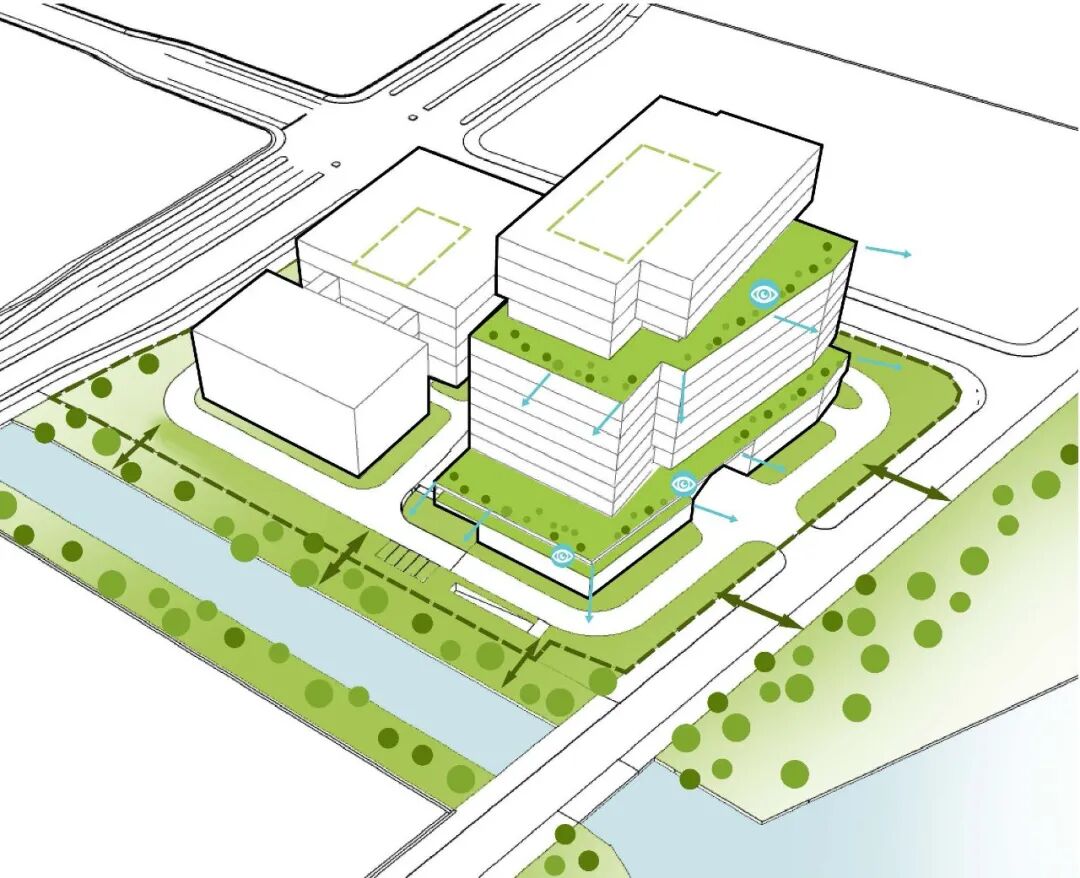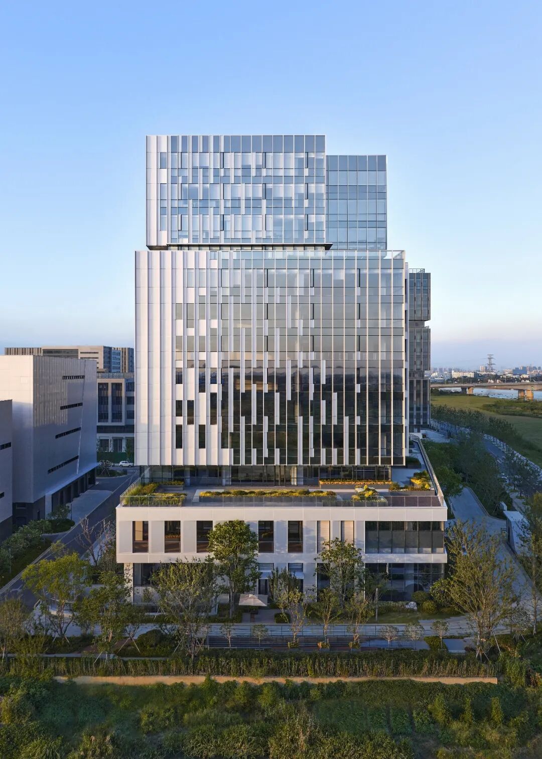 研发办公塔楼占据东南街角空间制高点,与周边地块在相同的60米高度下营造连续的滨江界面,加强吴淞江第一排天际线的整体感;3层、10层的形体向南、向西进行退进处理,打造维度的室外景观露台,建筑与景观形成的“山谷”意向与吴淞江对话。