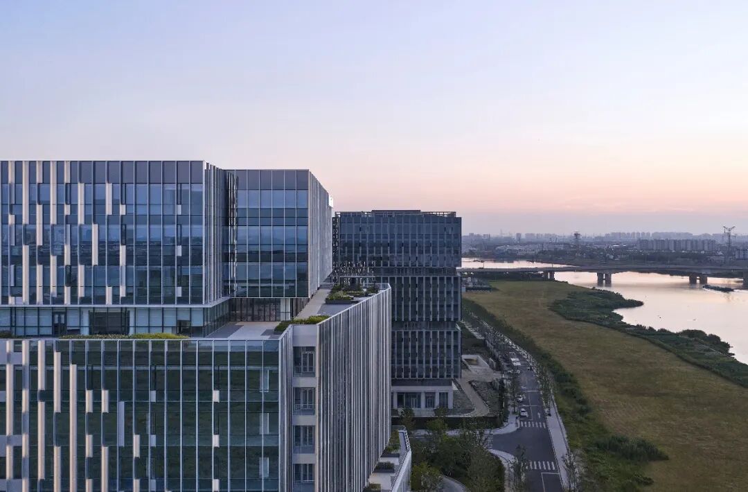 知行科技全球总部大楼沿吴淞江优越的地理位置使其肩负着打造科创展示面、织补滨江天际线的重要使命。设计团队在尊重城市设计基础上进行功能及体量布局研究,作为重要的沿江城市界面,项目力求通过一体化设计使整个片区内沿吴淞江界面过渡自然、建筑语言一致、立面材料呼应。在理性的总图布局下,各单体建筑高度顺应城市界面形成逐步上升的组合形态。为充分利用滨江的景观优势,结合不同标高、不同尺度的视线分析确定了各单体建筑的布局落位及形态操作。