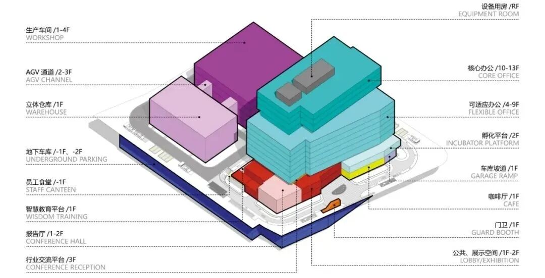 作为建筑功能高度复合的新质产业空间,知行科技全球总部集研发实验+生产制造+运营办公于一体。生产制造与研发实验在水平方向高效联系,大幅度提升自动驾驶系统配套域控制器及智能摄像头的生产能力,确保自动驾驶系统方案能够高效、稳定地转化为实际产品,加速技术产业化进程;研发实验与运营办公在垂直空间相互叠加,建设更为先进的研发实验空间,助力知行科技在自动驾驶领域的核心算法研究,完善的整车系统集成验证能力加速智能驾驶技术的迭代与优化,提升知行科技在自动驾驶技术领域的核心竞争力。