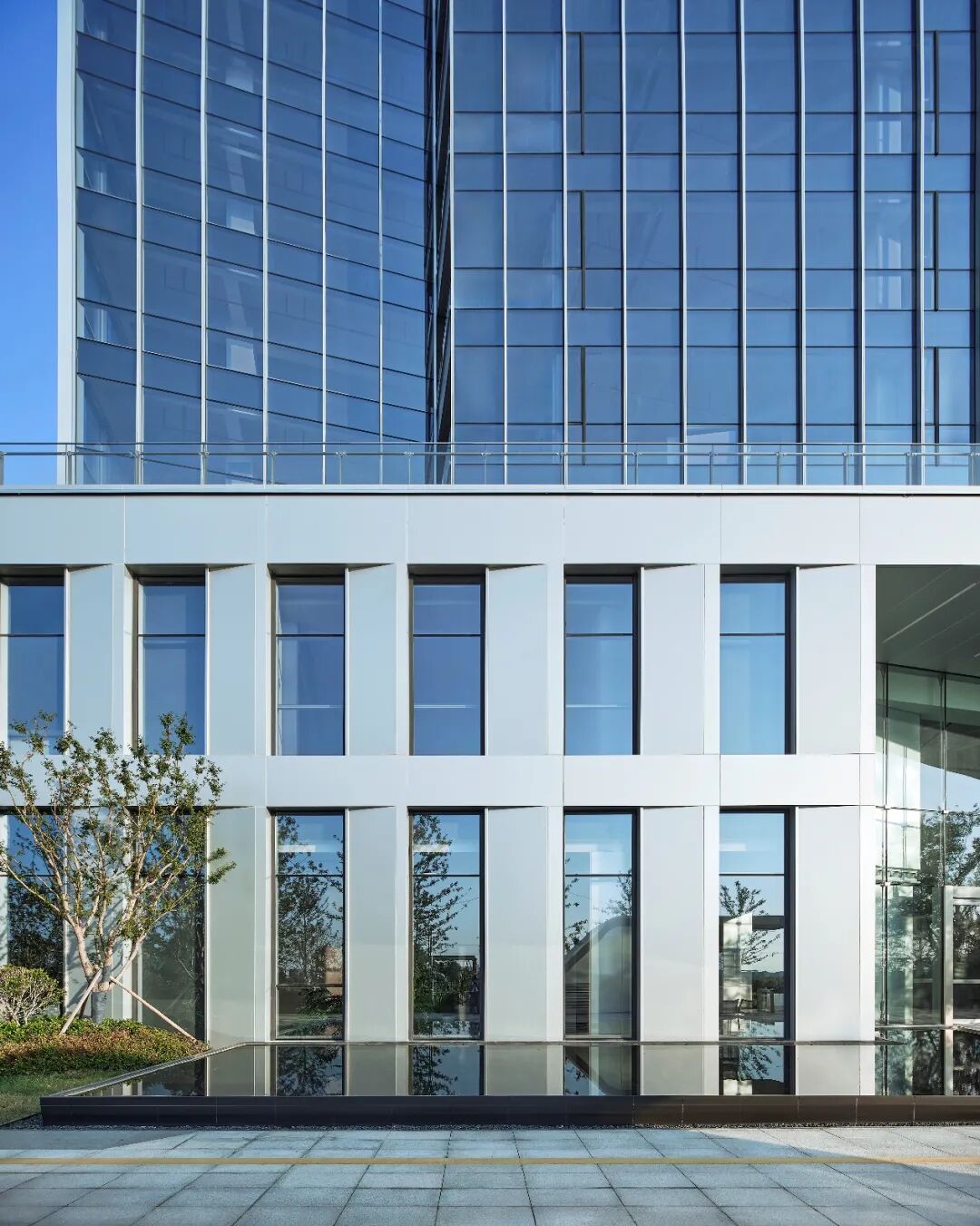研发办公楼的形式操作依顺地形的变化进行三段式设计,底部体量(1-2层)用蜂窝铝板幕墙形成坚实的底座,但每个单元的细部倾角又削弱了近人尺度体量的压迫感;中段为较大体量的玻璃幕墙,平面形态仍旧顺应地形边界,配合竖向线条增加挺拔感;上段虽同为玻璃幕墙的立面语汇,但形体的退进操作将顶部的总部办公功能扭为正南朝向,延续挺拔感的同时增加了形体的变化。在铝板与玻璃的材料颜色选择上注重与周边建筑相融合,以期使区域在吴淞江一线相得益彰。