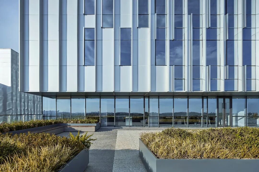 建筑西侧通过秩序有致的铝板幕墙和玻璃幕墙的过渡变化,既有效地实现了西晒遮阳又形成了有趣的立面肌理。“山谷”意向的营造,使得退台平台中的景观处理有效地吸收了建筑热量。
