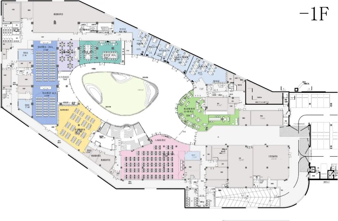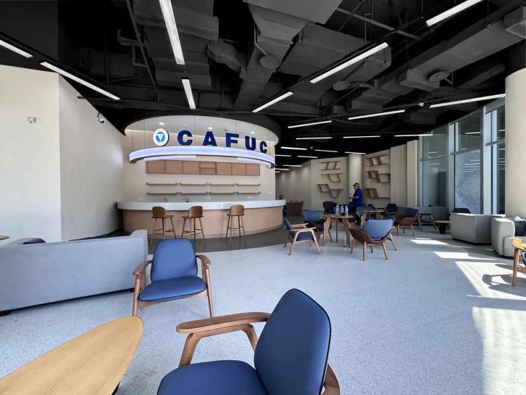 秉持“效率为轴,多元为翼,创新为魂,绿色为基”的理念,设计团队直面T1/T2栋建筑异形、空间低效等痛点,以效率优先原则重构空间。采用“一体化切割重组”方案,将展销大厅、管控平台布局于地上一层;地下层集中设置智慧教室、考试区等核心功能区,通过下沉庭院与幕墙设计结合实现自然通风采光,空间利用率提升50%以上。该布局既满足了中飞院无人机执照考点的严苛标准,又适配了“规模化人才培训”的政策要求。