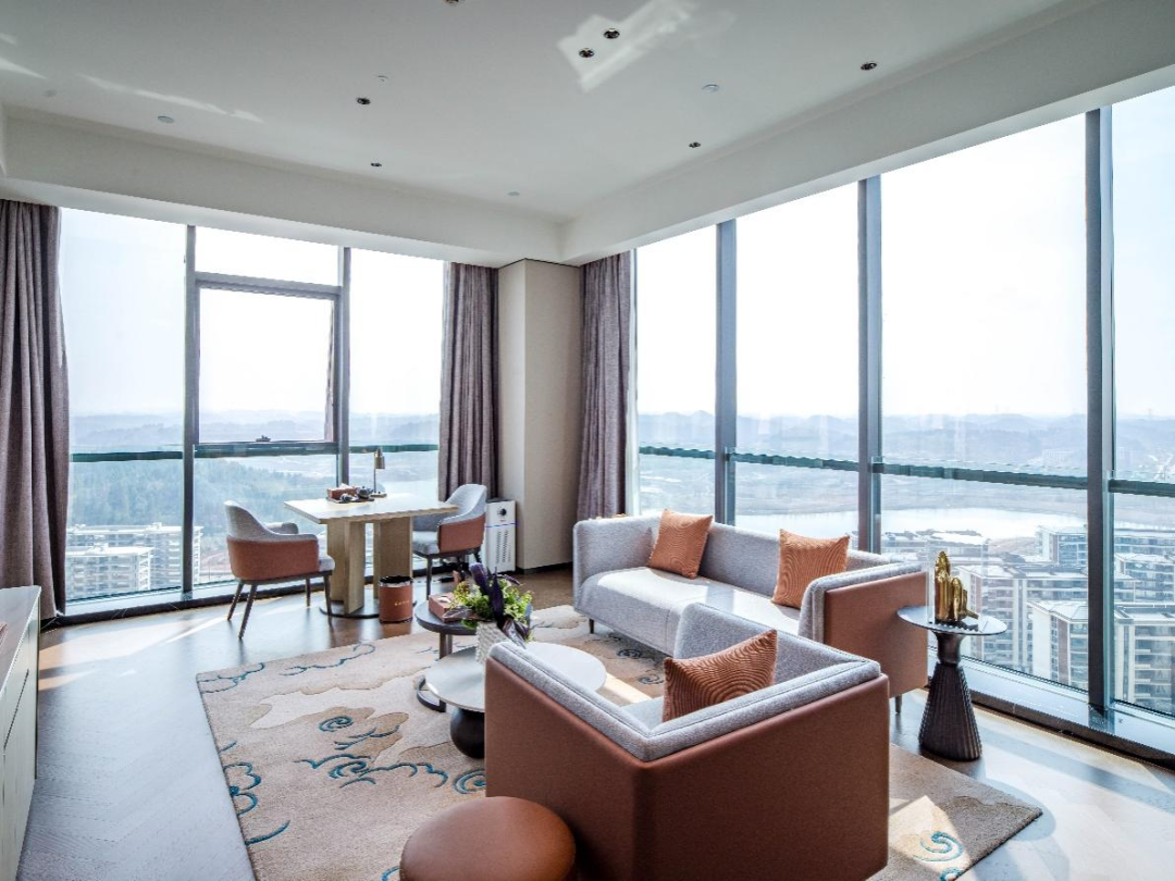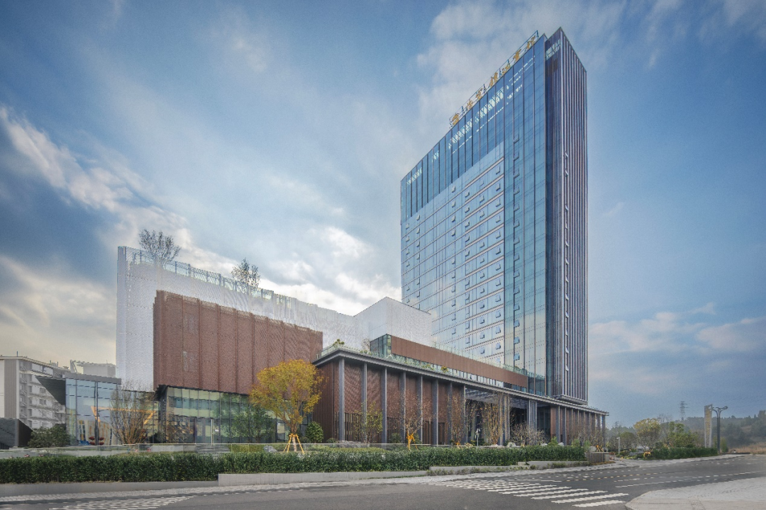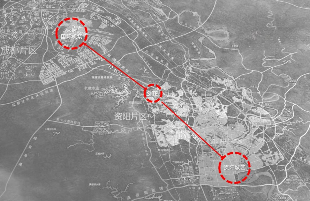 资阳临空锦江宾馆位于资阳市天府国际机场临空经济区雁栖湖组团。临空新区依托天府国际机场的区位优势,打造集滨湖生态住区、高端酒店集群及国际化教育配套于一体的综合服务片区,通过产城融合与生态赋能,构建宜居宜业的现代化活力新城。临空锦江宾馆地处城市临空经济区核心枢纽位置,紧邻区域性航空港交通换乘中心,周边汇聚高端商务总部集群与城市绿芯生态公园,是衔接航空客流、商务人流与城市生活场景的稀缺地理节点,这一独特区位使其具备了成为城市片区标志性建筑的先天基础。