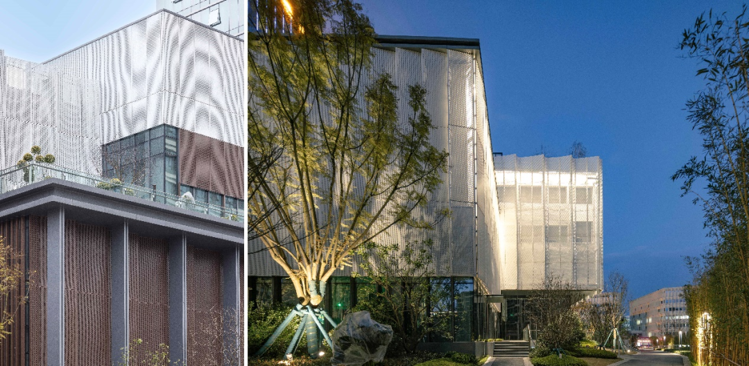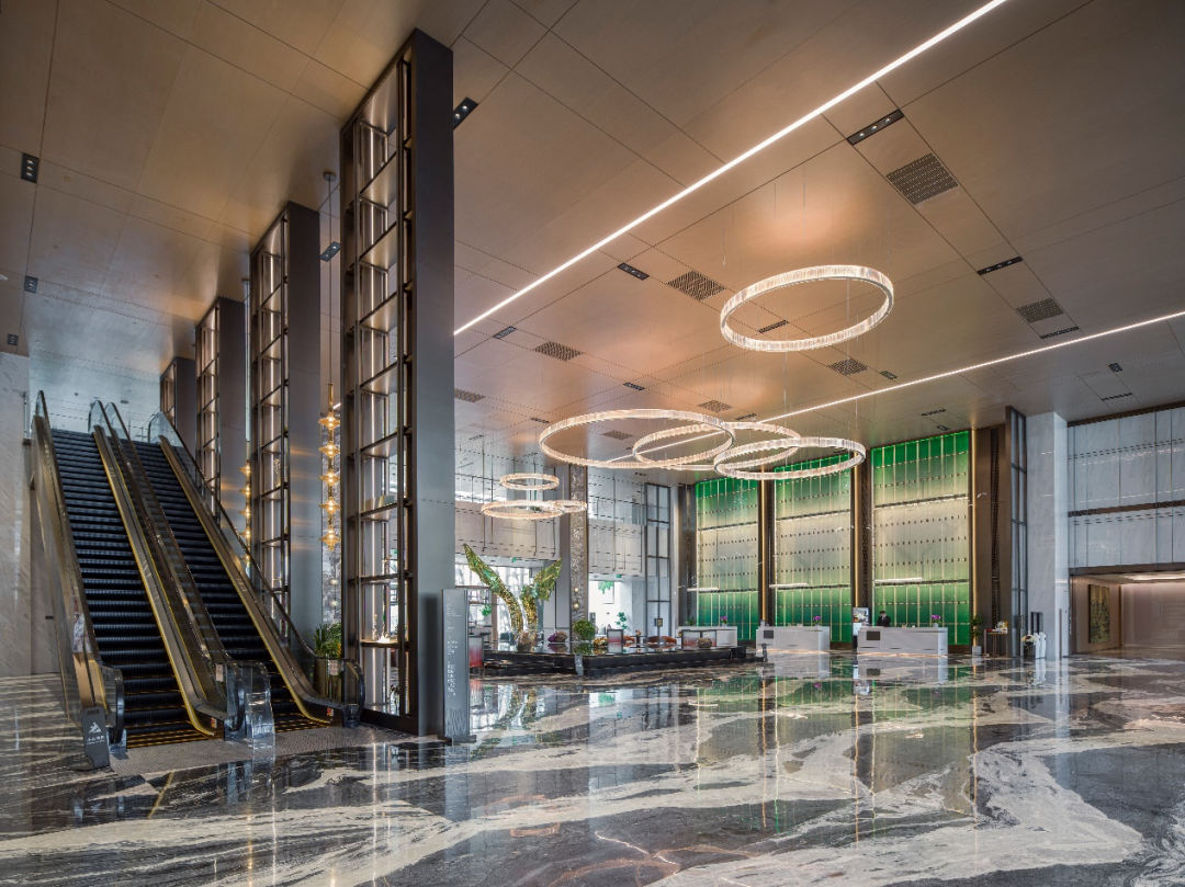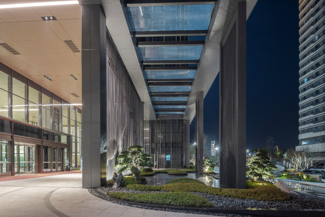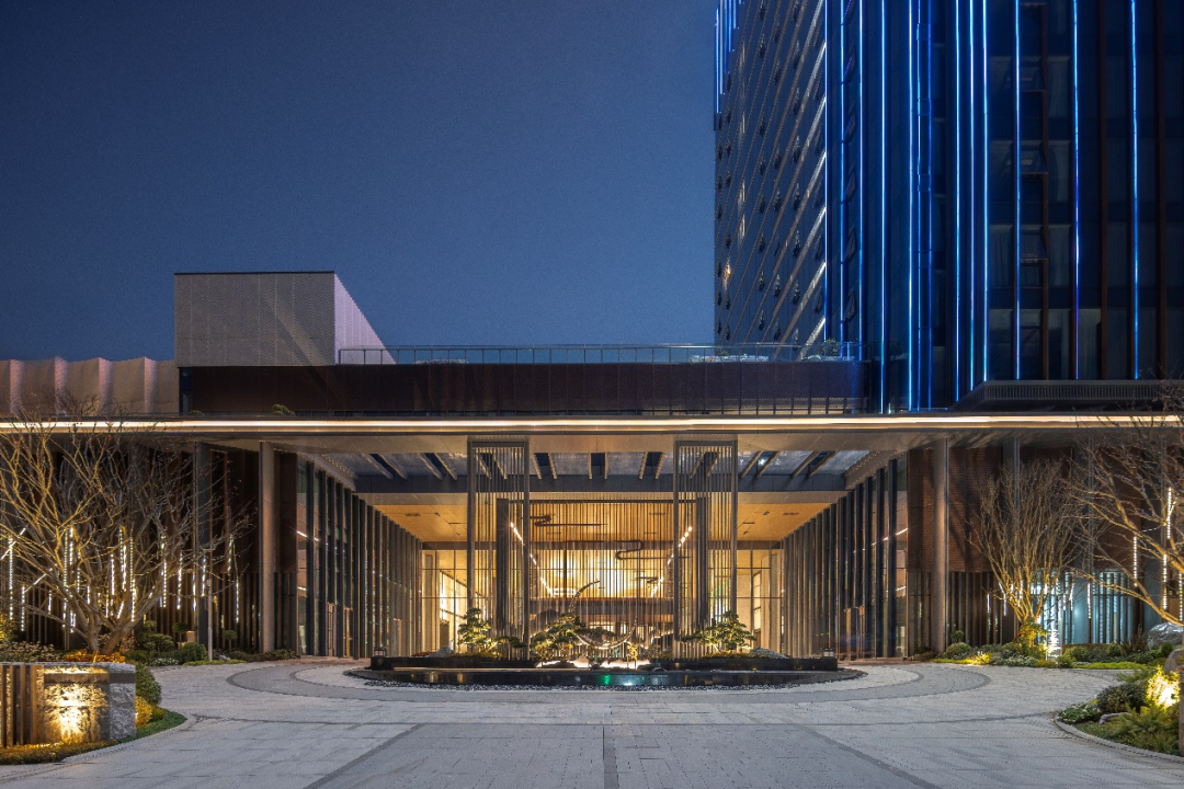 立面设计以 “精致韵律” 为核心,通过装饰柱廊、镂空格栅与高透玻璃的虚实结合,构建层次丰富的建筑表情。定制化的铝型材柱廊,形成庄重而不失轻盈的序列感;弧形穿孔铝板幕墙模拟水波纹理,阳光透过时在灰空间投射出粼粼光影;建筑在裙房形成体量穿插,通过体块的错动与叠加,在建筑底部形成退台、灰廊等过渡空间,客人穿行其间,可感受材质肌理、光影变化与空间尺度共同营造的体验感,实现功能理性与美学表达的统一。