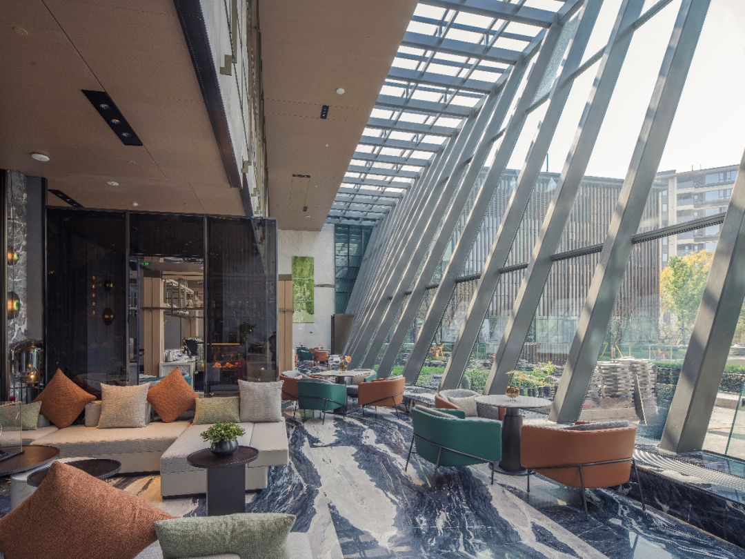 大堂吧以通高玻璃幕墙为媒介,将内院水庭景观引入室内,构筑镜花水月、虚实相生的空间体验。曲面玻璃的运用不仅强化了建筑与自然的对话,也成为内院视线的焦点,重新定义了室内外的视觉边界。