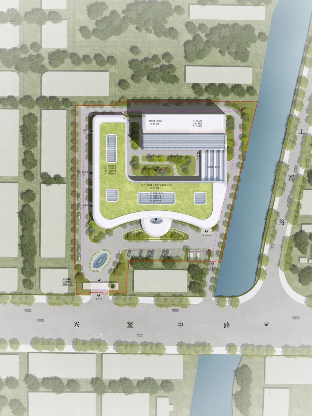 地处鳌江水系之畔,兴鳌院区将自然视为最珍贵的疗愈资源。设计巧妙引入“生态主轴”概念,将东侧沿河生态景观资源纳入建筑语境。