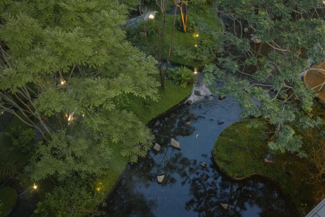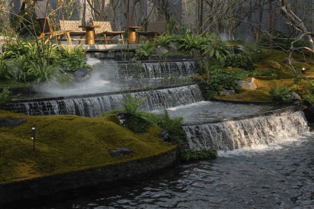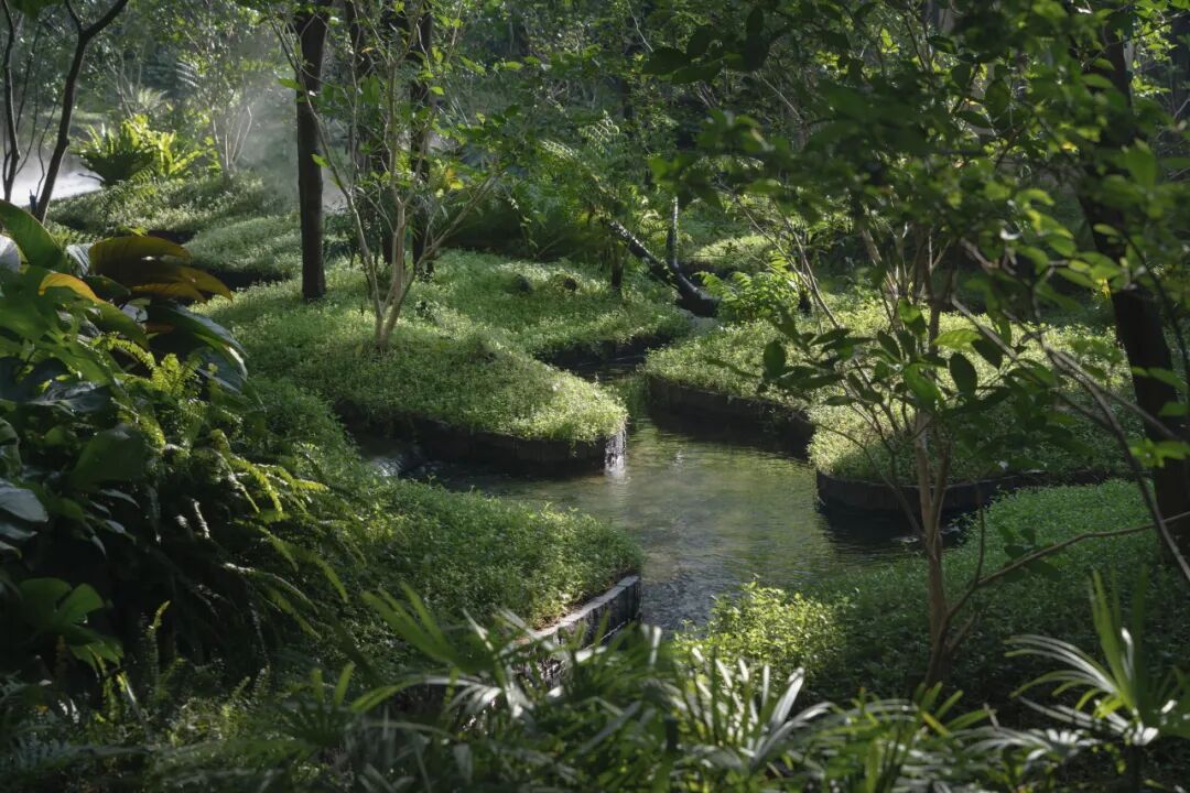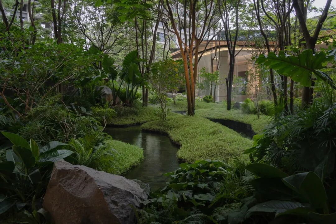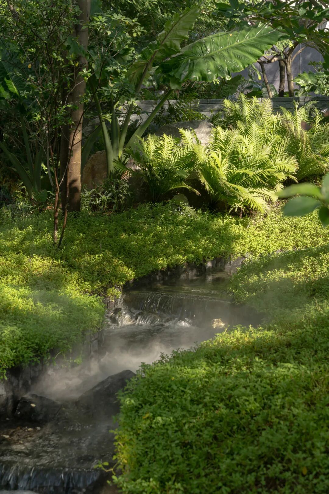 溪水自高处起笔,沿绿岛的脉络缓缓流淌,在微地形重塑与生态渗透系统的协同下,形成多级跌水与浅流的复合景观结构。它既遵循地形的逻辑,也顺应自然的心意,水院不止是一方景致,更是一种被时间与自然共同书写的诗。