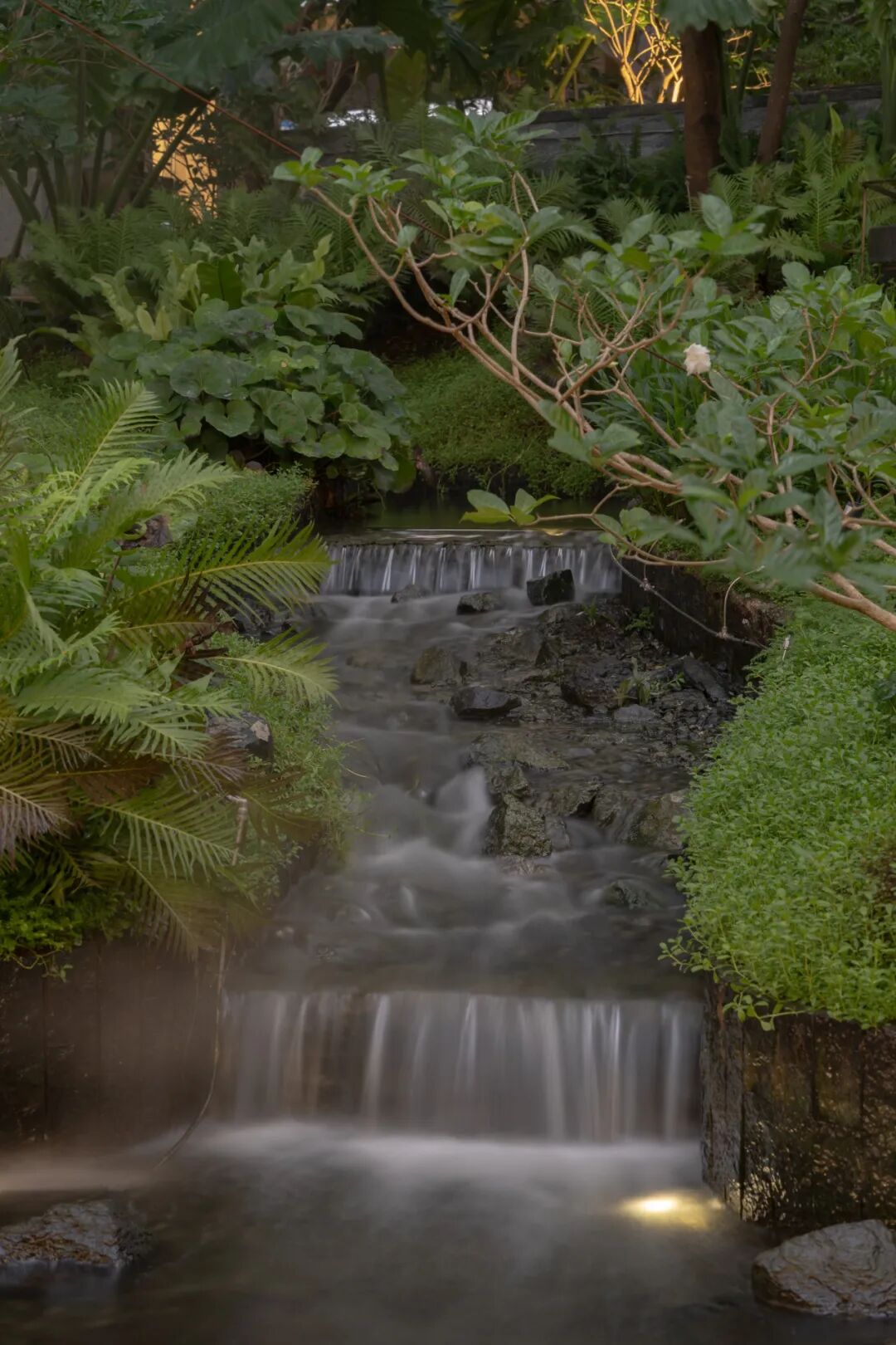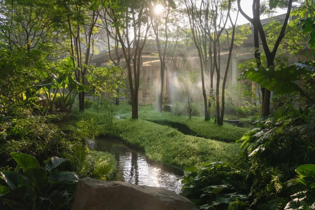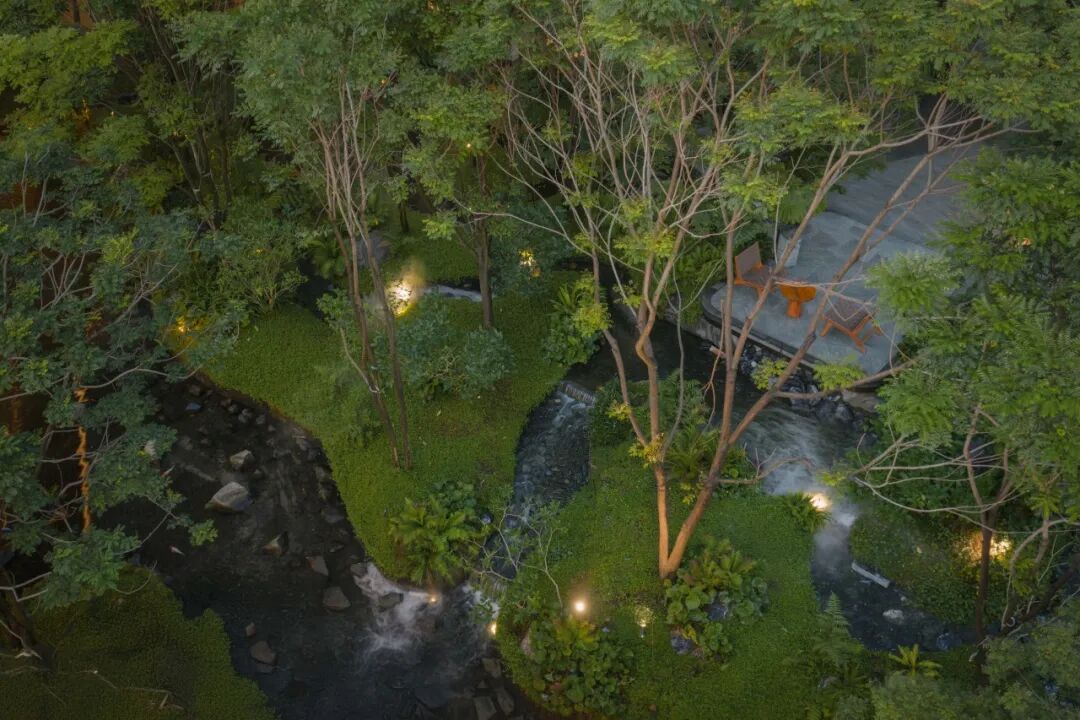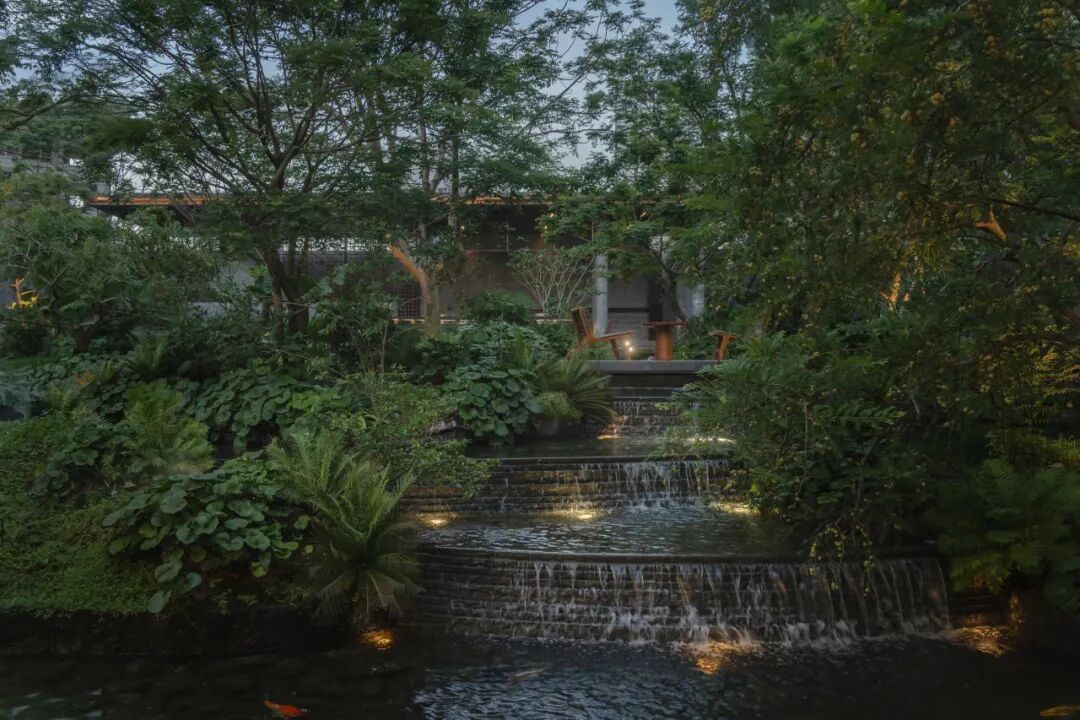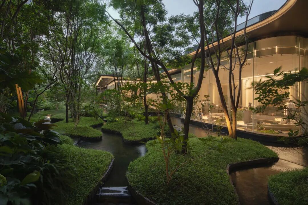 溪水自高处起笔,沿绿岛的脉络缓缓流淌,在微地形重塑与生态渗透系统的协同下,形成多级跌水与浅流的复合景观结构。它既遵循地形的逻辑,也顺应自然的心意,水院不止是一方景致,更是一种被时间与自然共同书写的诗。