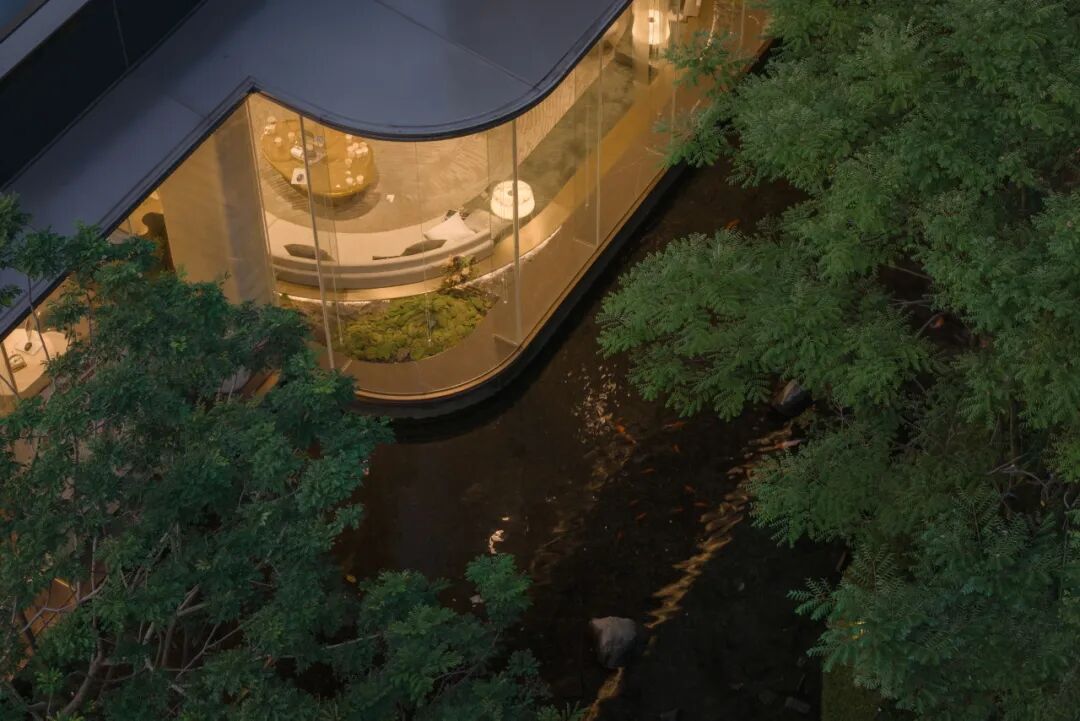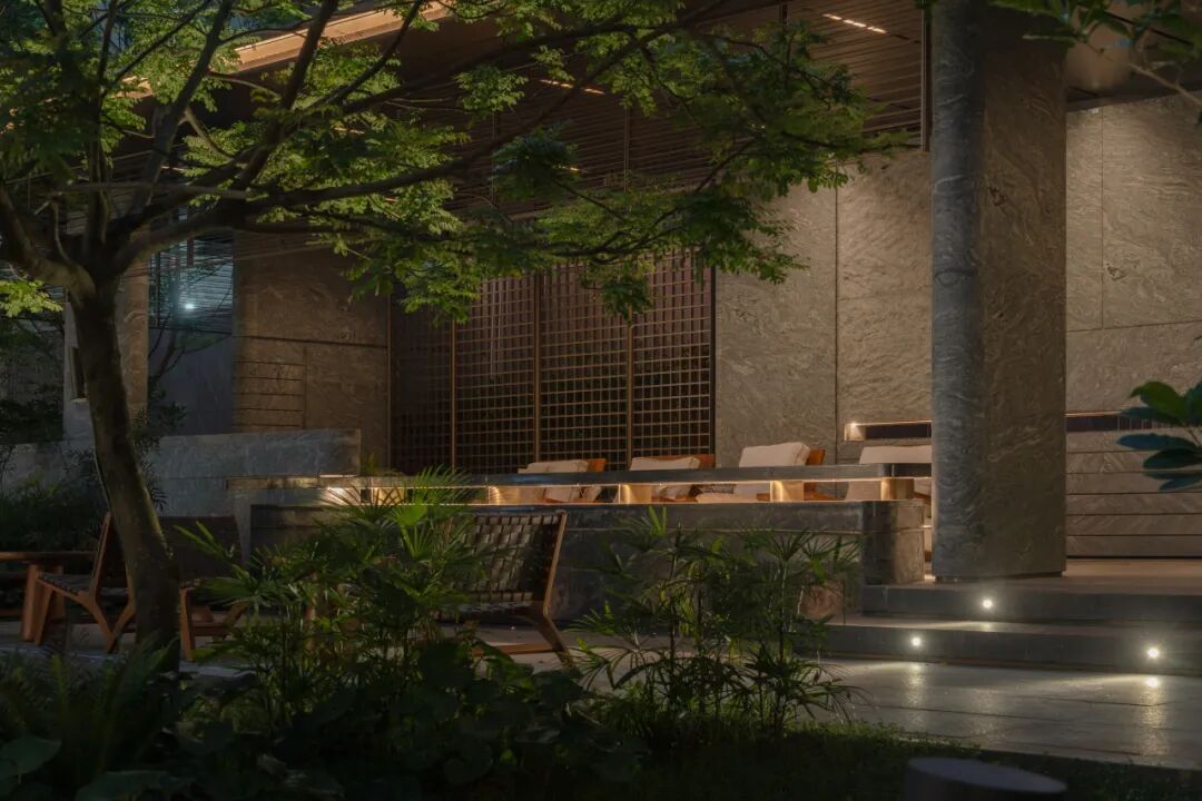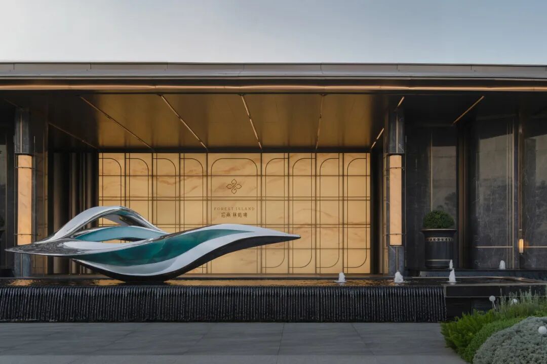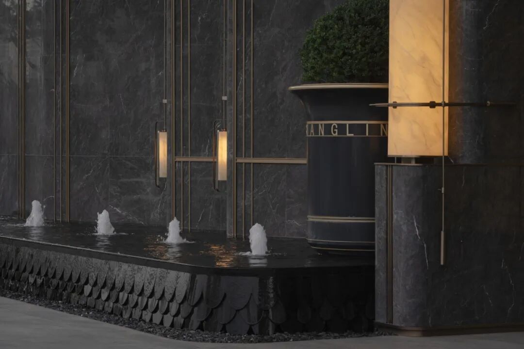 门头体块与点景雕塑相辅相成,以体量与尺度构筑视觉焦点。水流潺潺,折射出雕塑的优雅姿态;光影在水面与材质之间流转、交叠,为入口注入艺术的张力与自然的生命律动,使空间在理性构筑与感性体验之间达成平衡。