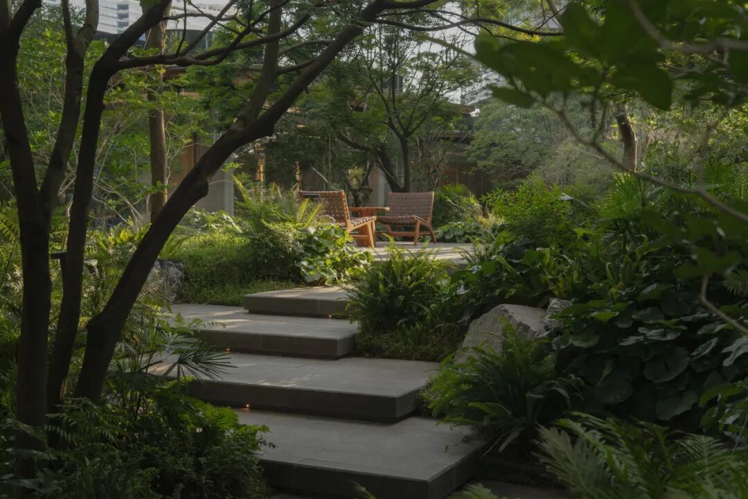 “游观心印”是一种身体与场所的互动秩序。拾级而上,平台休憩处,光影在植被与铺装之间游移,微风携带自然气息与声响,渗入每一次呼吸。空间不仅承载停驻,也通过尺度、材质与层次的连续实现心理过渡,使“行走”与“停留”在感知中形成自然的空间张力。