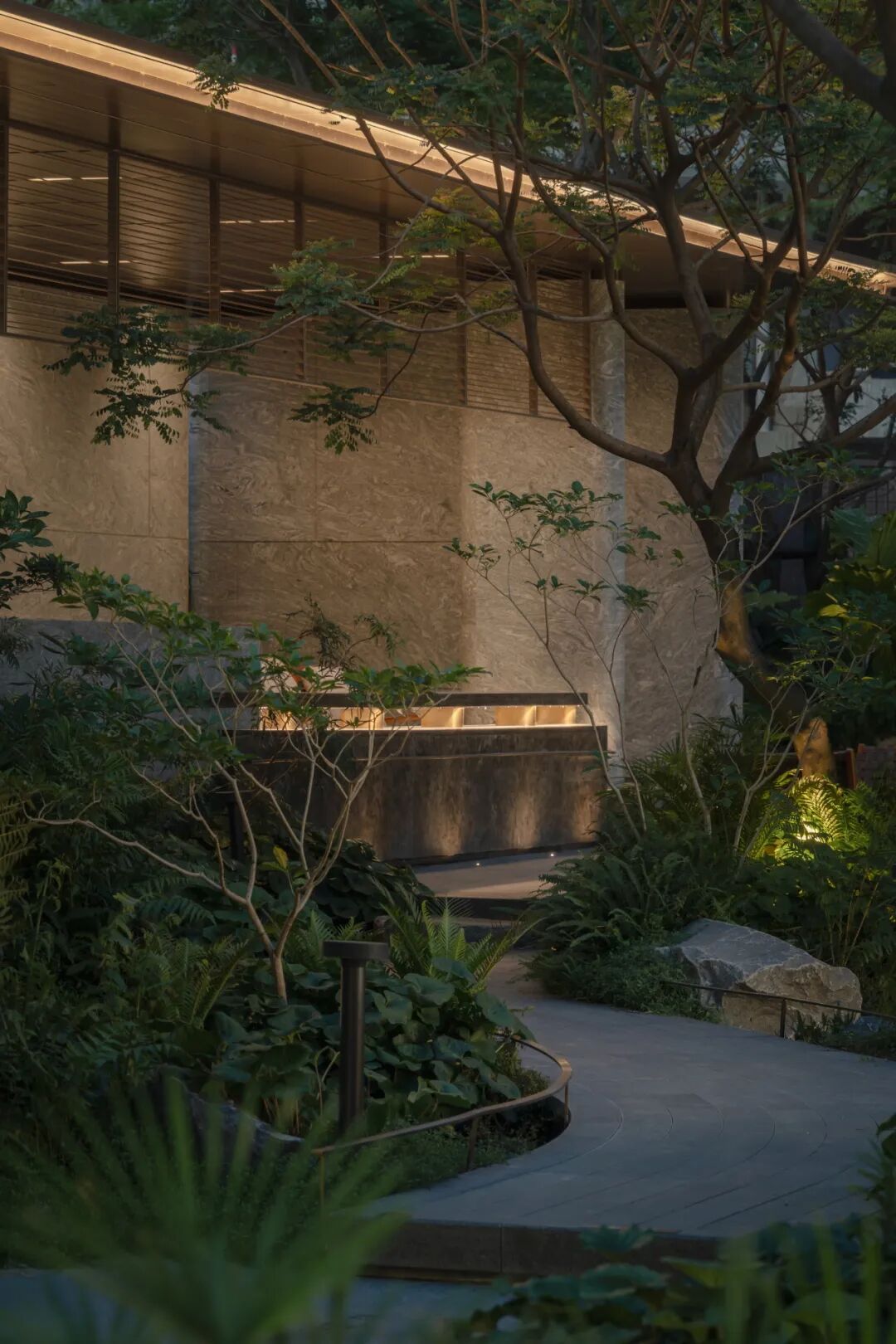 设计以绿岛为引,顺势铺陈水流的方向,塑造场地的自然基底。平台和建筑一半濒水,一半倚岸,溪水在山石的错落之间溢出,其间落瀑、溪涧、浅滩、微波、清淼、细流,在柔软的苔林间潺潺,从山间绕出又隐去,人也在隐隐绰绰间相对,高雅中散发出温润的深邃。