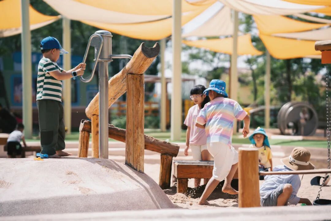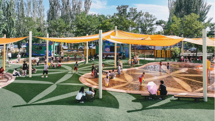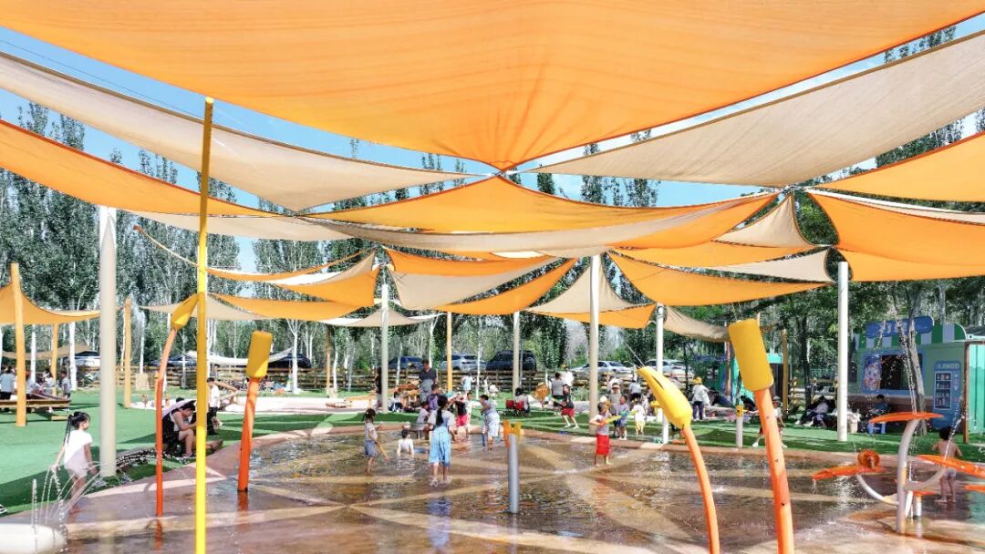 在塞上江南,欢乐玩水更受青睐。一个综合性玩水区域,大大小小花蕾造型的喷水设施和浅滩水面供人肆意玩耍。此起彼伏的喷雾中,感受大自然的清凉。