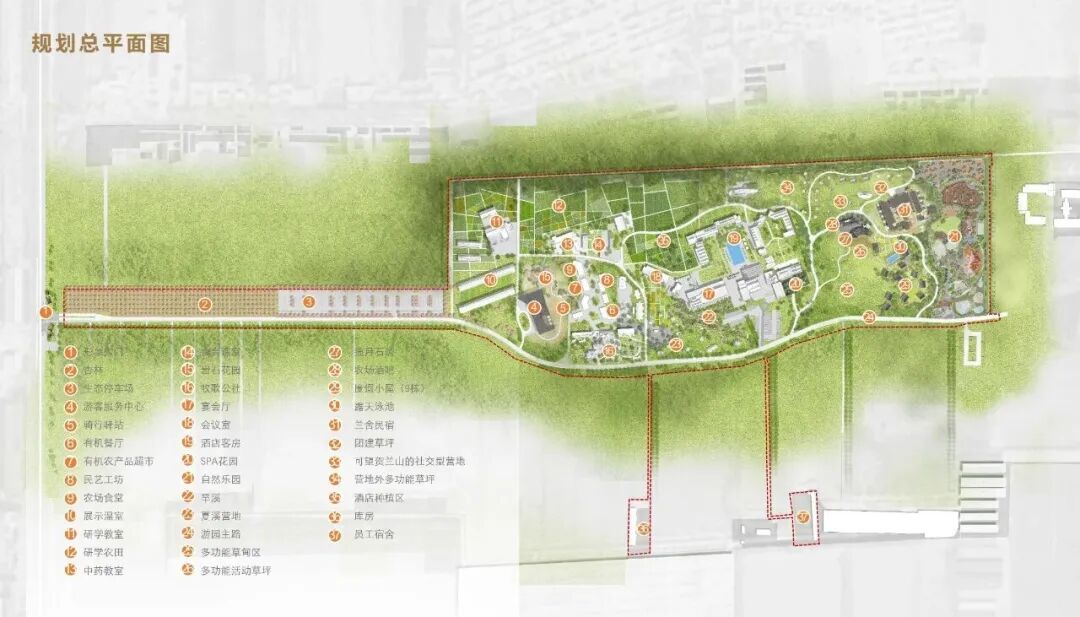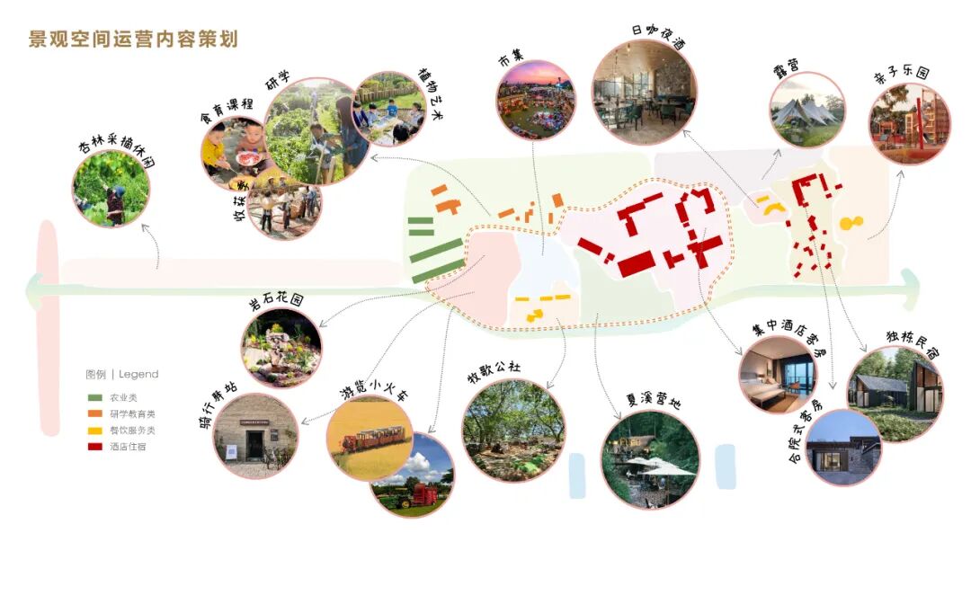 我们在对兰一生态园的整体规划中,采用山野中的自然乐园+亲子服务+文旅住宿的方式递进开发。结合乐园、露营、民宿、酒店、研学、农田、市集、日咖夜酒等业态,构建集理念、美学、内容、商业模式四位一体的文旅度假综合体。