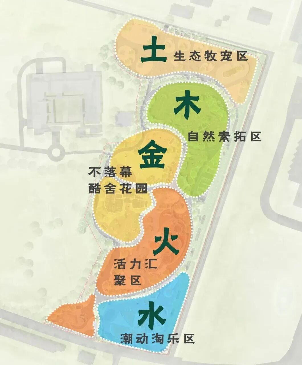 乐园内部分为”金木水火土“五大自然场景。入口广场和服务配套建筑承担人流集散和餐饮服务功能。