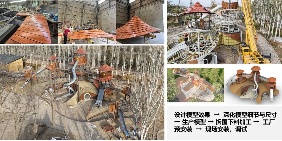 作为乐园的规划设计及落地方,团队负责所有功能布局、保留与改造、在地种植、美学调性、色彩视觉的构建,在限价控制下促成建造落地。不局限于环境景观规划、游乐设施等,而是跨专业涉及策划、图纸、生产、督造、安装、运营跟踪等方面,并在各环节形成闭环。