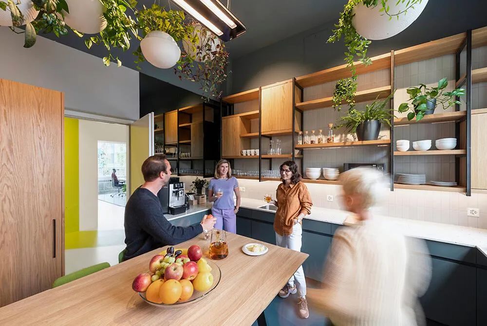 创建一个更大、更时尚的公共厨房是关键的优先事项之一。通过拆除一堵紧挨的墙体,厨房比之前扩大了一倍,从而形成一个非常舒适的公共空间,让大家在一起快乐烹饪、共享午餐,如此为自己的工作团队创建了一个舒适放松的社交聚会区。