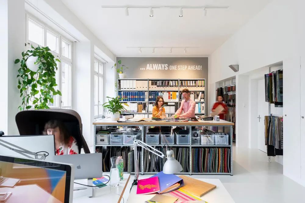 开放式办公室用玻璃隔墙划分为三个新的区域。这样的设计意图有助于满足另一个关键要求——创建一个宽敞的样品间。在这里,所有的样品都合理规划摆放,便于大家轻松寻找和获取,位于中央的一张大台面便于大家展示、翻看和讨论。