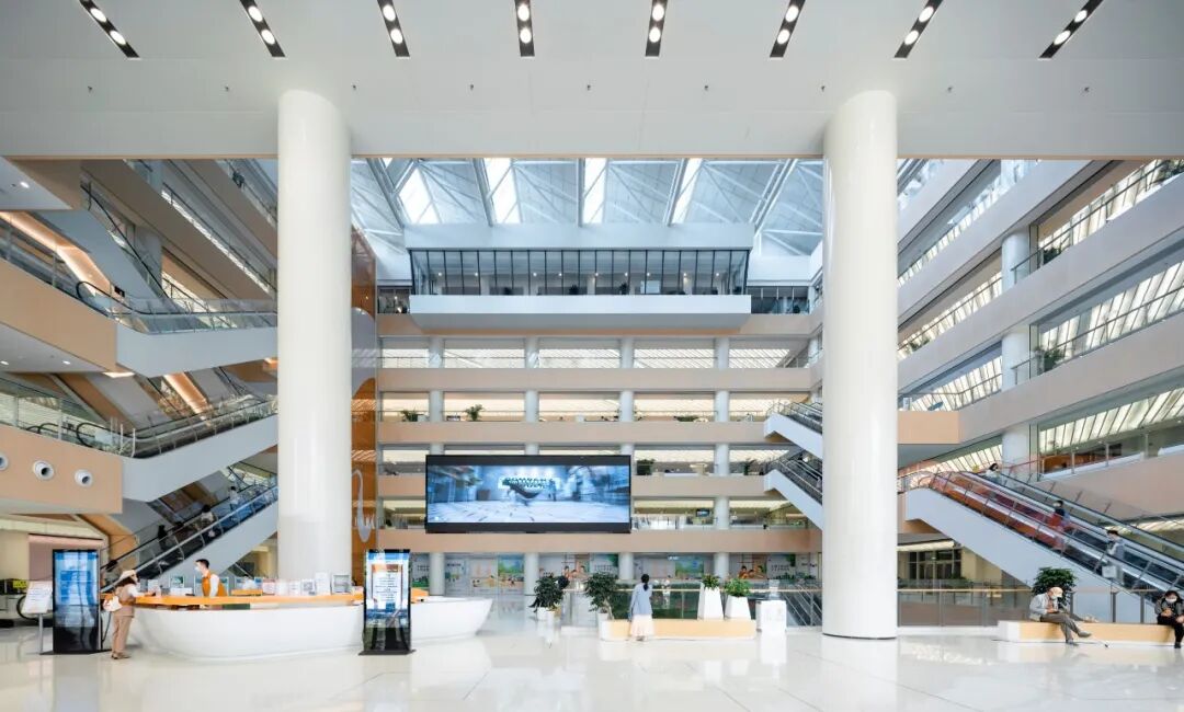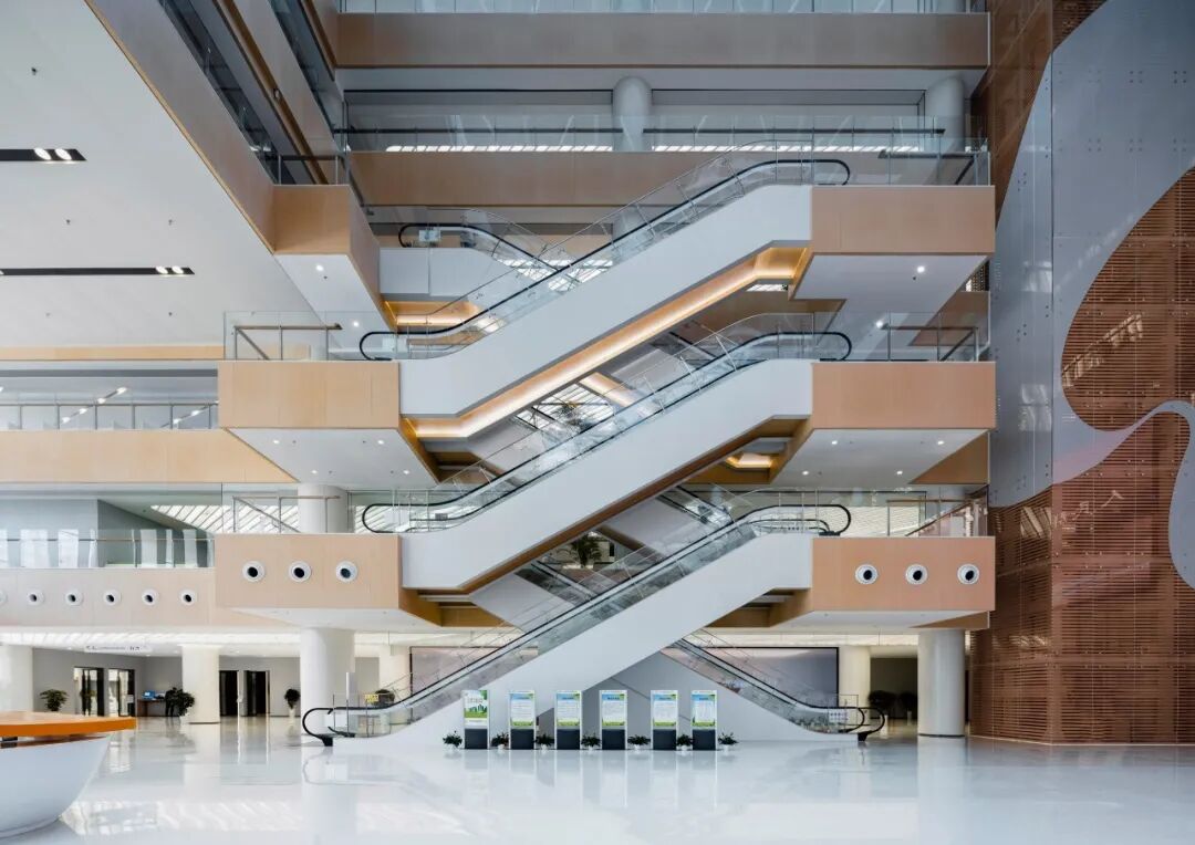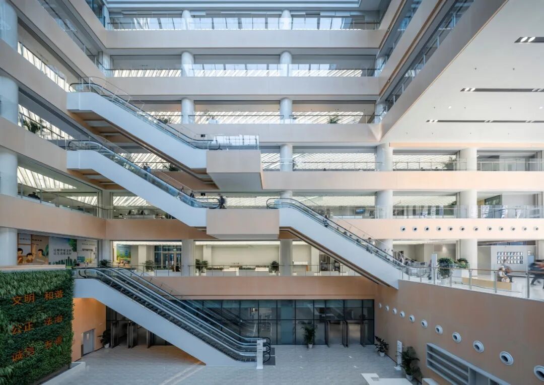 建筑采用独特的风车形布局,将政务服务大厅作为室外“公共空间”的延续,在水平方向上,通过东、西、北三个方向的通道,将室外空间与室内的通高中庭无缝连接,创造了一个公共、开放、易达的城市市民客厅,不仅增强了空间的连贯性,也为市民提供了便捷的通行路径。在垂直空间上,通过竖向中庭空间巧妙地连接各楼层,构建出一个开敞而通透的市民客厅。