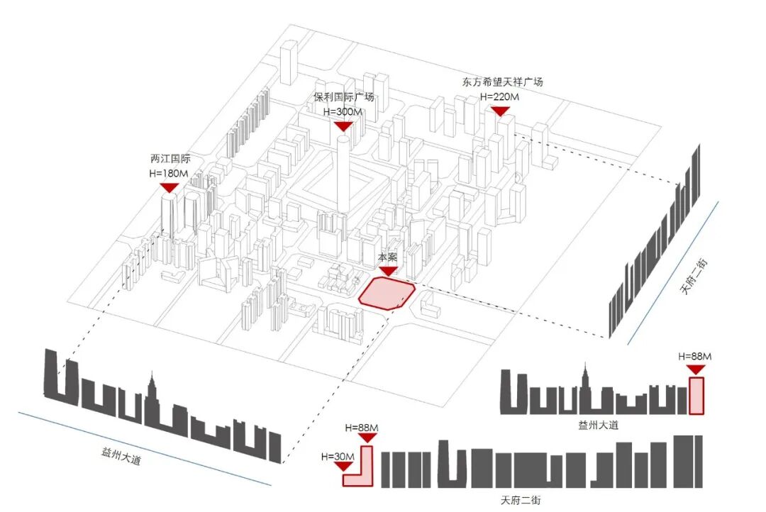 大源商务核心区以300m高保利大厦为地标中心,并以超高层建筑作为关键节点,沿益州大道和天府二街已经形成了丰富的城市天际线。本项目设计限高为130m,方案从城市视角入手,设计88m高L型主楼及30m高的裙楼体量,和谐地融入周边城市空间。在临近路口的位置,我们退让道路红线30m作为城市开敞空间,用于建设市民广场,以减轻高层建筑对城市转角空间的压迫感,营造出宜人的空间尺度。