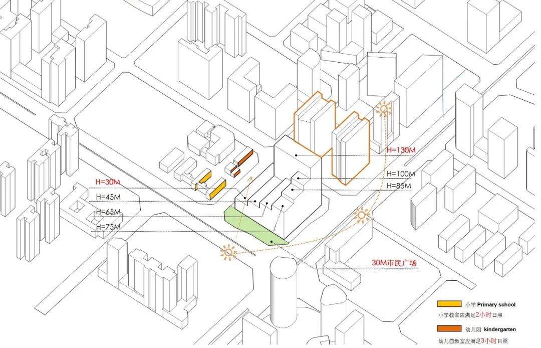 北侧紧邻的小学和幼儿园的日照需求是本项目的重要限制因素,通过细致的日照分析,我们确定了项目在满足日照标准的前提下可实现的最大建筑体量。在此基础上,我们对比了多个设计方案,最终选择了容积率最高的方案,以实现土地资源的高效利用,同时兼顾城市空间的舒适性和功能性。这一决策不仅优化了项目的经济价值,也充分考虑了城市环境和居民生活质量的提升。