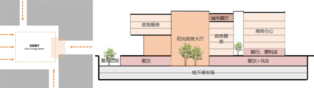 #8 风车形裙楼建筑布局(左) 多元开放的功能构成(右)