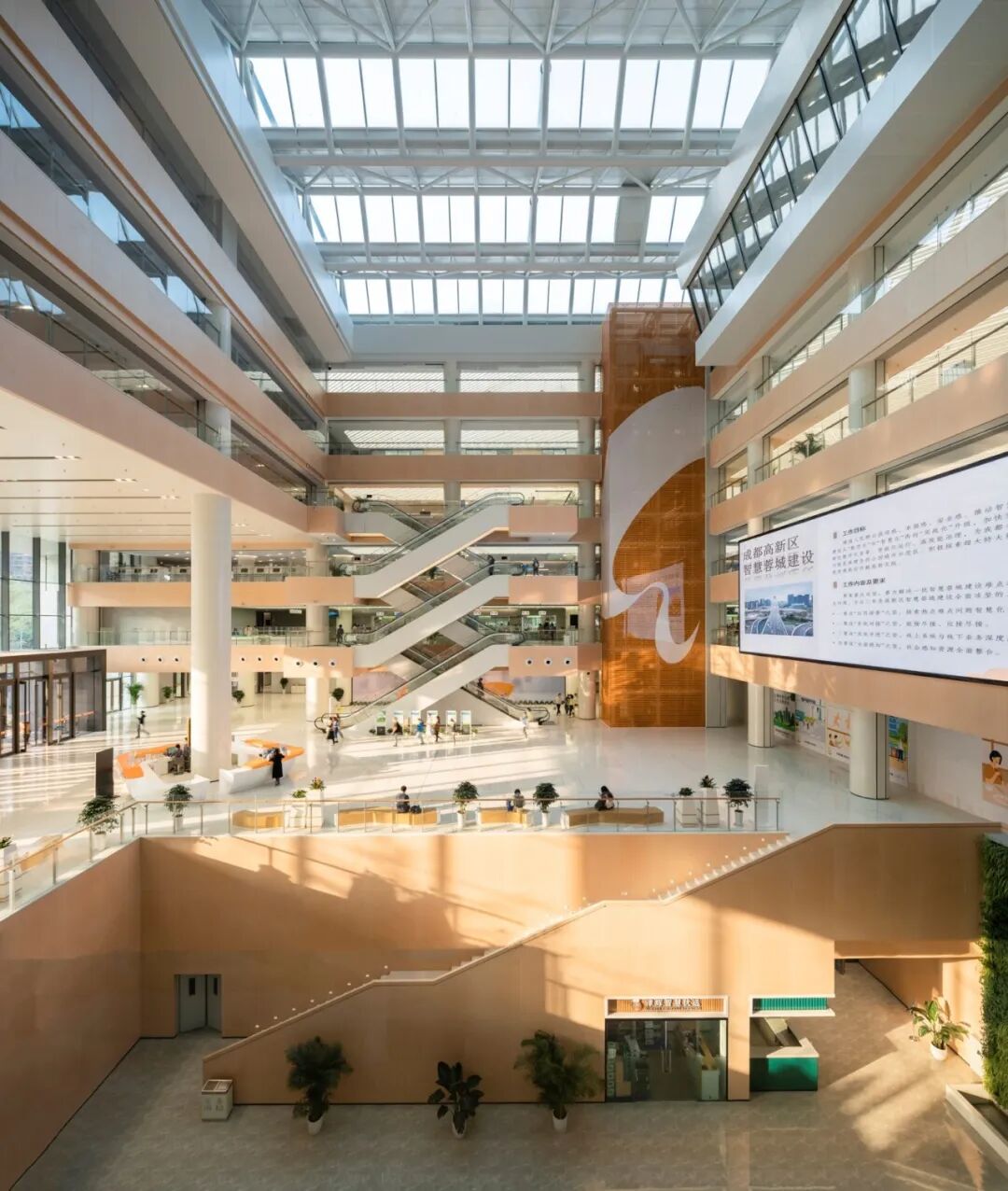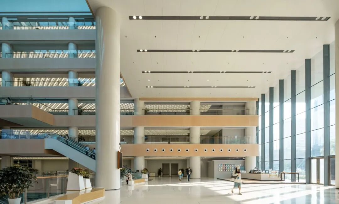 项目除核心政务服务功能外,还提供了多元的人性化公共空间,包括银行、便利店、展览区、职工之家、餐饮区、咖啡馆等功能空间,使得整个政务服务大厅不仅是一个高效的行政场所,更是一个充满生机与活力的城市公共空间。空中绿化及阳光中庭的设计,给政务服务空间带来了舒适的体验和乐趣。木纹质感的城市展厅,形成了城市大厅的视觉焦点,其温暖的质感和色调为空间增添了亲和力。