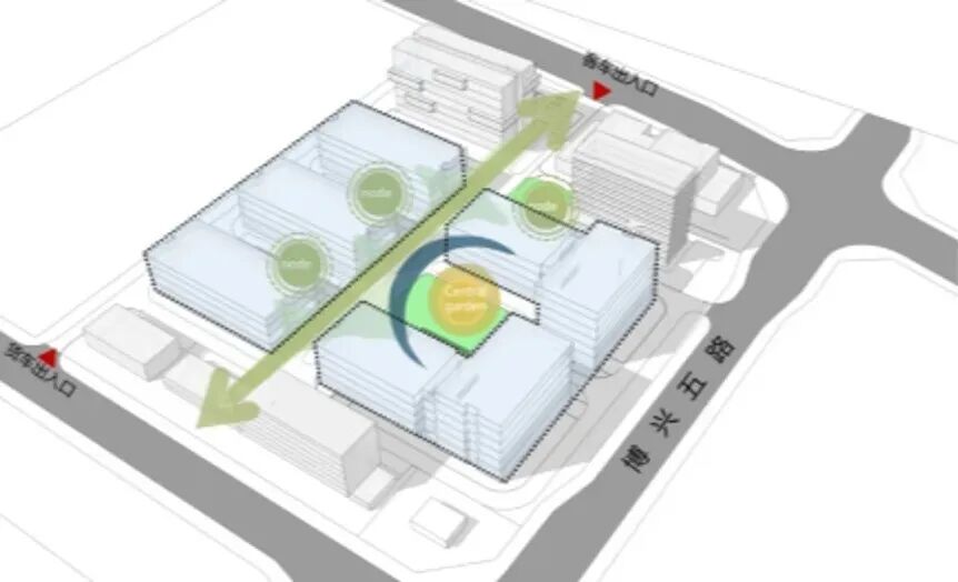 “一心”为地块中央的景观核心,以公共绿地为“芯”,打造花园式园区。景观设计兼顾实用性与多样性,提供休憩、交流、展示的多功能空间,提升园区环境品质。