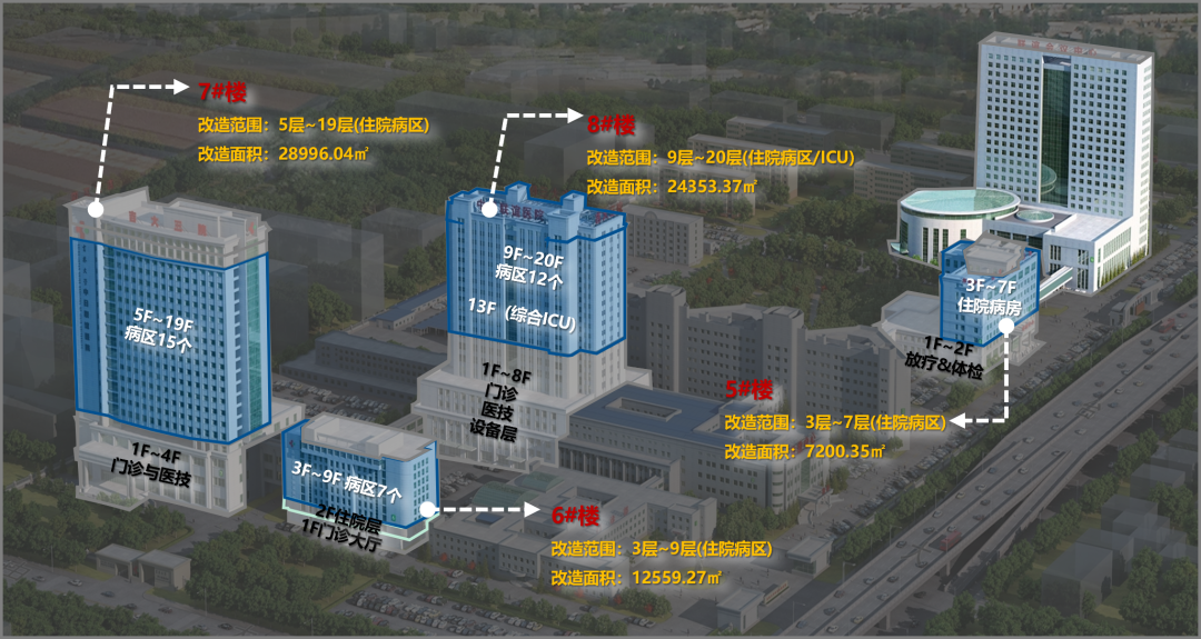 针对5-8号楼“超期服役”的设施, 从“水电气暖”到“医用专项”,进行系统全面焕新,支撑医院高质量运营: