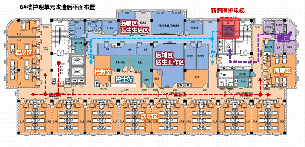 功能分区革新:每个护理单元实现 “患者治疗区、医护工作区、医护生活区、污区” 四分区;6号楼护士站从 “分散两处” 整合为 “集中管理”,医护动线缩短;6号楼还新增医护专用电梯,既解决了医护人员的使用问题,又提升了竖向交通的使用效率;污物用房紧邻污物电梯设置,方便污物转运,避免洁污交叉;
