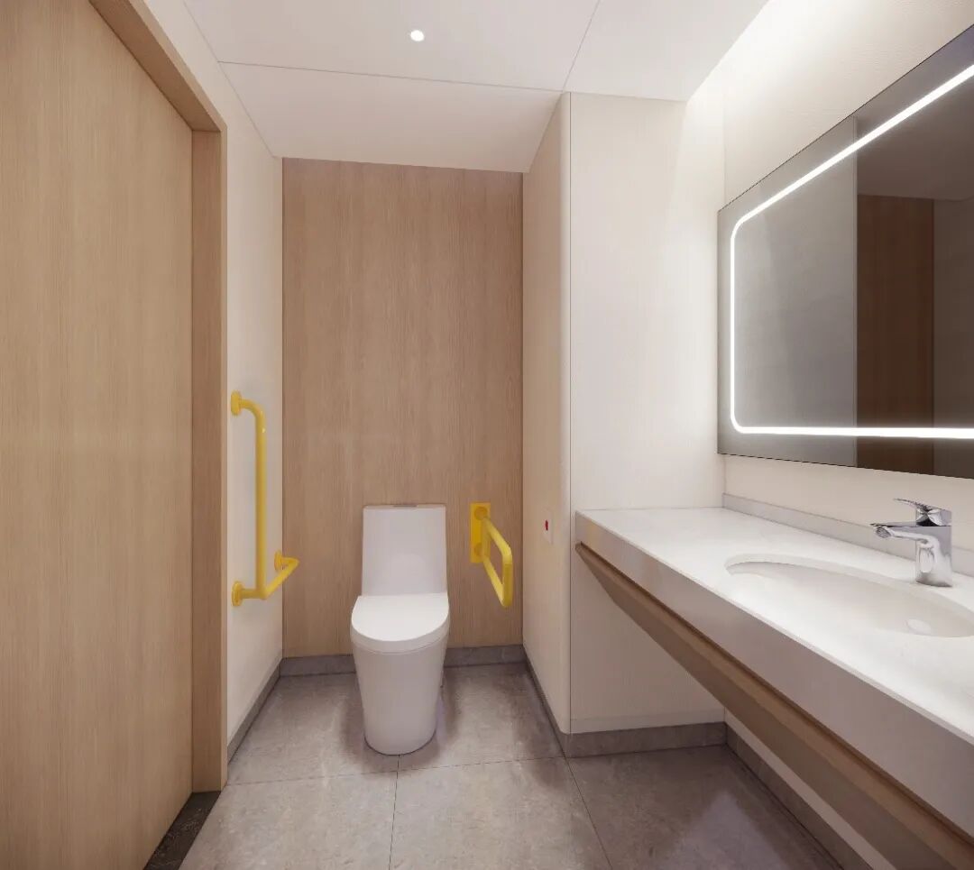 无障碍覆盖:适老化病房卫生间采用防滑地砖、设置应急呼叫按钮、无障碍扶手,适老化病区走道宽度满足轮椅、病床移动通行,公共区域设置无障碍盲道、倾斜镜面,适配老年及残障患者需求。
