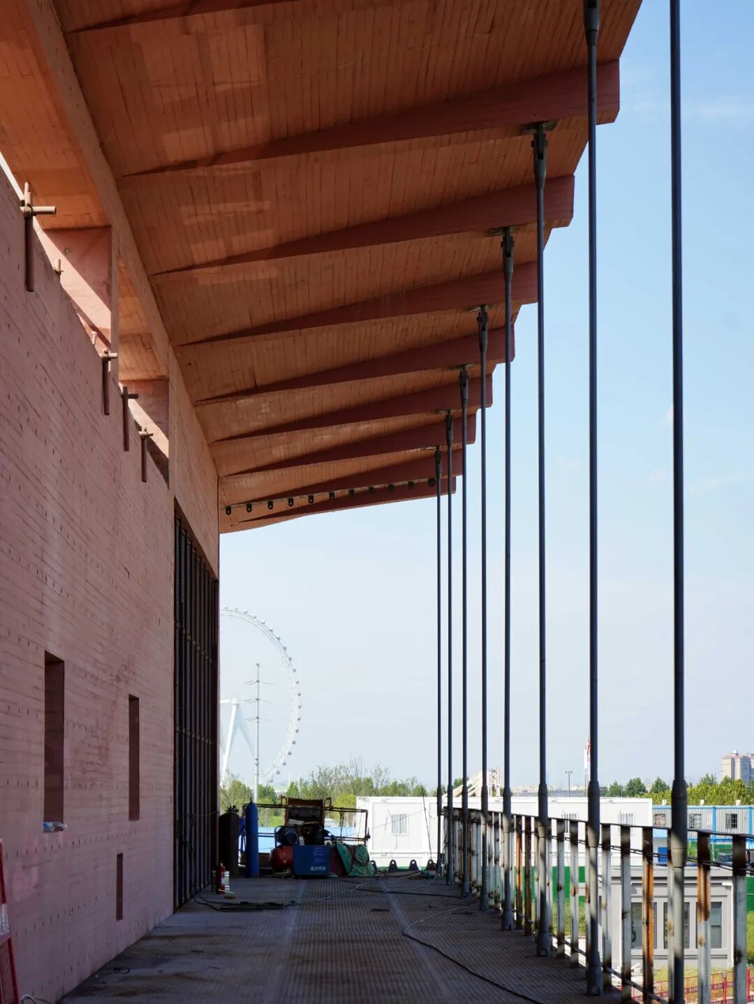 室外下沉庭院中,伫立的金属结构柱形成一片轻盈而富有张力的柱林,围合出一处开放包容的公共空间。这些金属柱体以当代设计语言重新诠释了场地原有的林木意象,在光影交错间,仿佛重现了往日枝叶扶疏、绿意层叠的自然景致。穿梭其间,访客可感受到空间所传递的生命脉动。而从建筑内部向外望,视线亦能穿越柱林的间隙,与外部环境形成无声的交流,形成空间内外彼此渗透、相互对话的和谐关系。